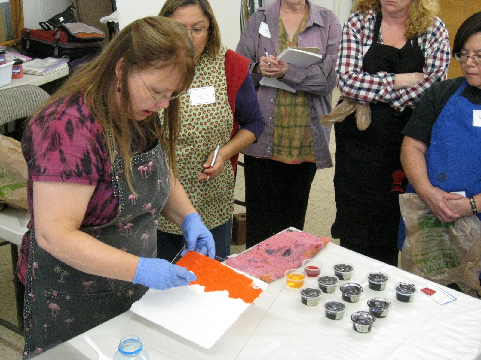 Carol applies the dye in her unique way to get an even distribution of colour on the sample.