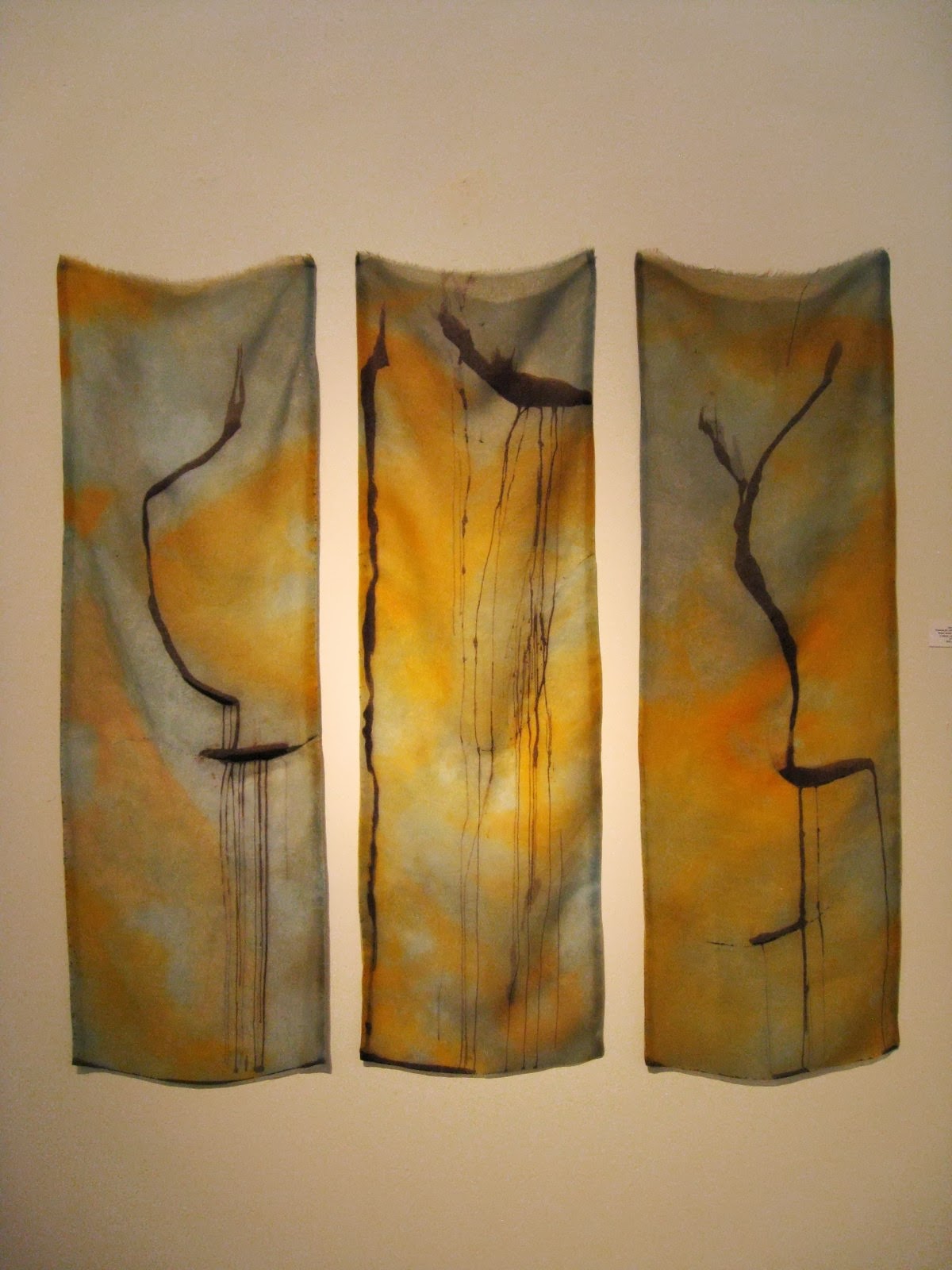 'Residue #9 (Why I Wake Early)', 3 pieces, each 40" x 13"Elise Dereinger's work is very different - opaque where Kelsey's is transparent.Here Elise has run ink and sand inside silk, dyed pillow-case forms. Her spontaneity and lines-left-to-chance contrast with Kelsey's intense pre-planning.I was sorry I couldn't get more images of Elise's work.