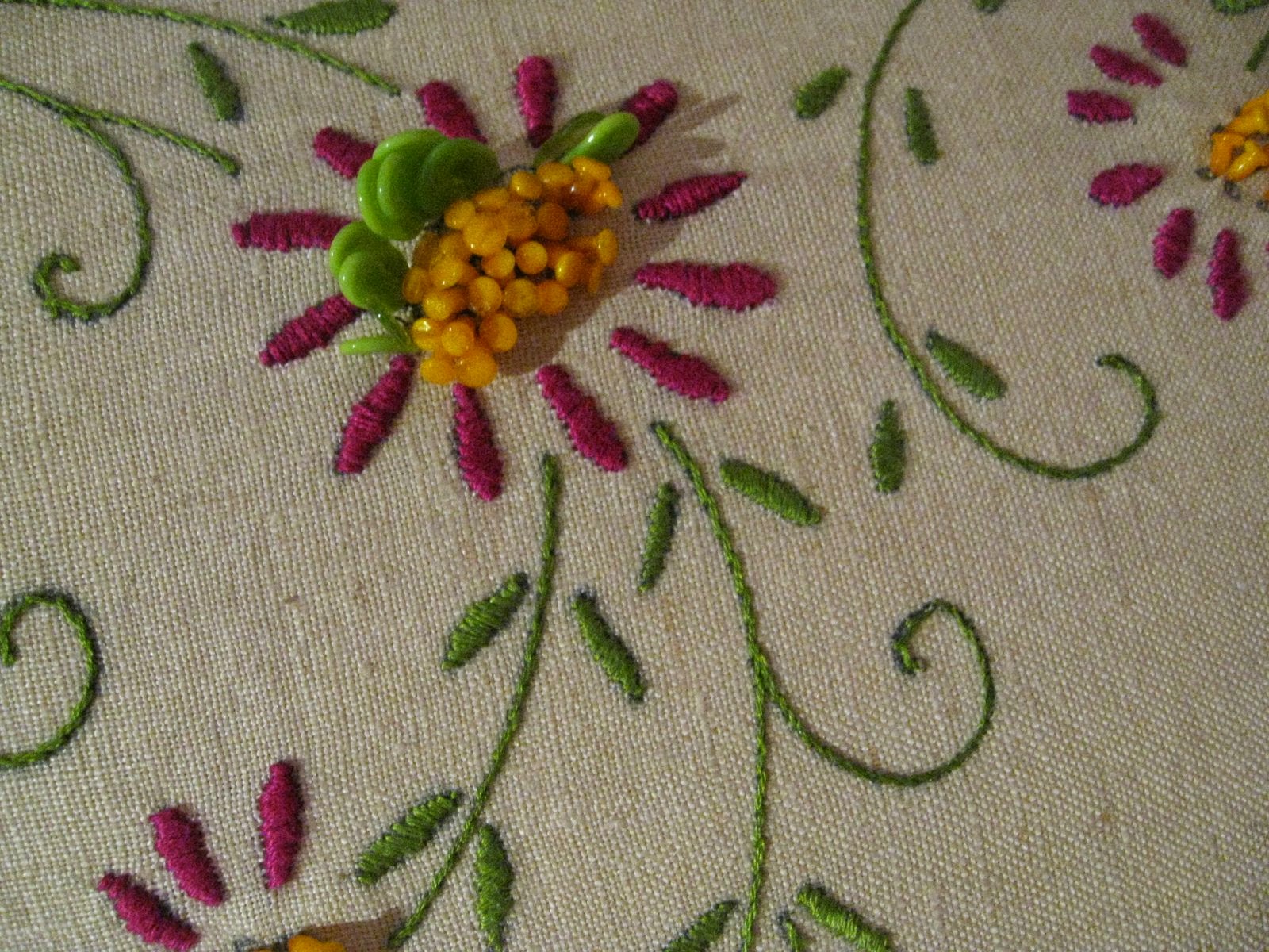 It looks as though Vanessa used vintage iron-on transfers to place the motifs on the cloth imitating the embroidered table cloth but here the motifs are not placed in the conventional locations. She then embroidered the motifs in the traditional way using silk thread.Glass embellishments were added.