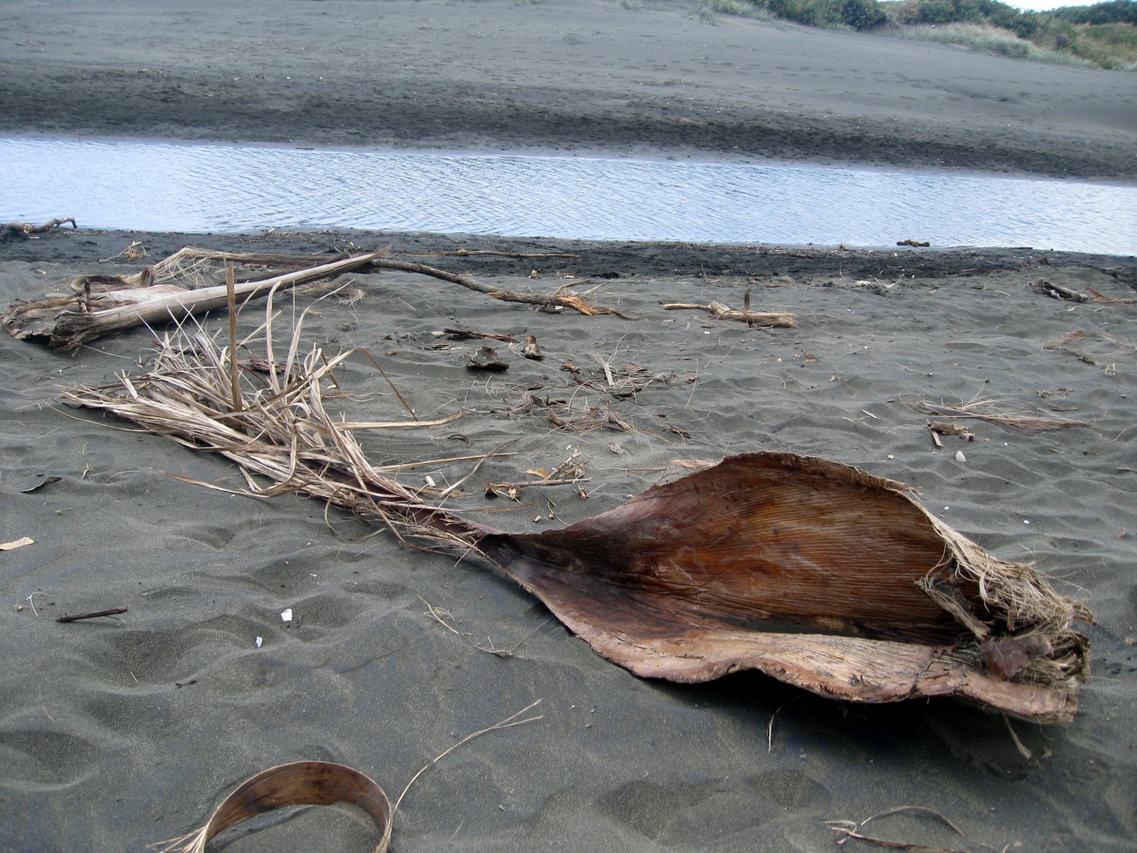 A number of times, while on a recent holiday, I played around with materials I found.Here is a nikau palm leaf on a beach.
