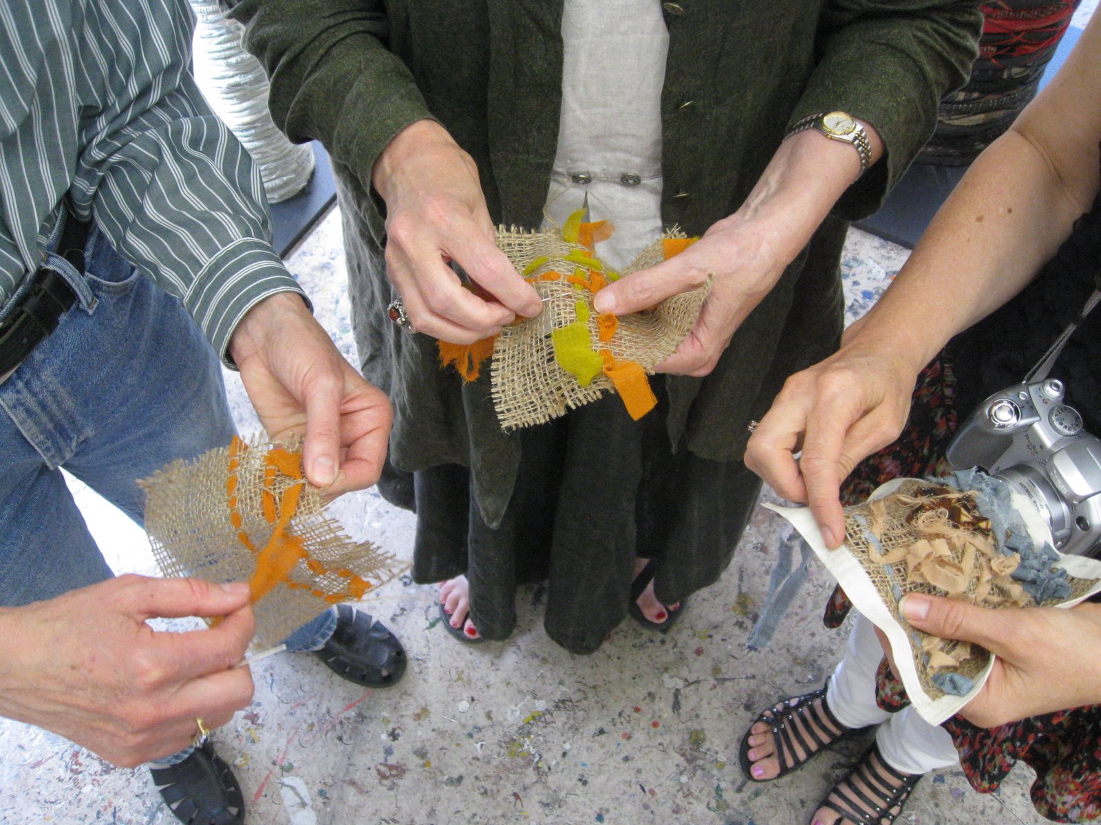 People watching the demos practiced making backgrounds on burlap.