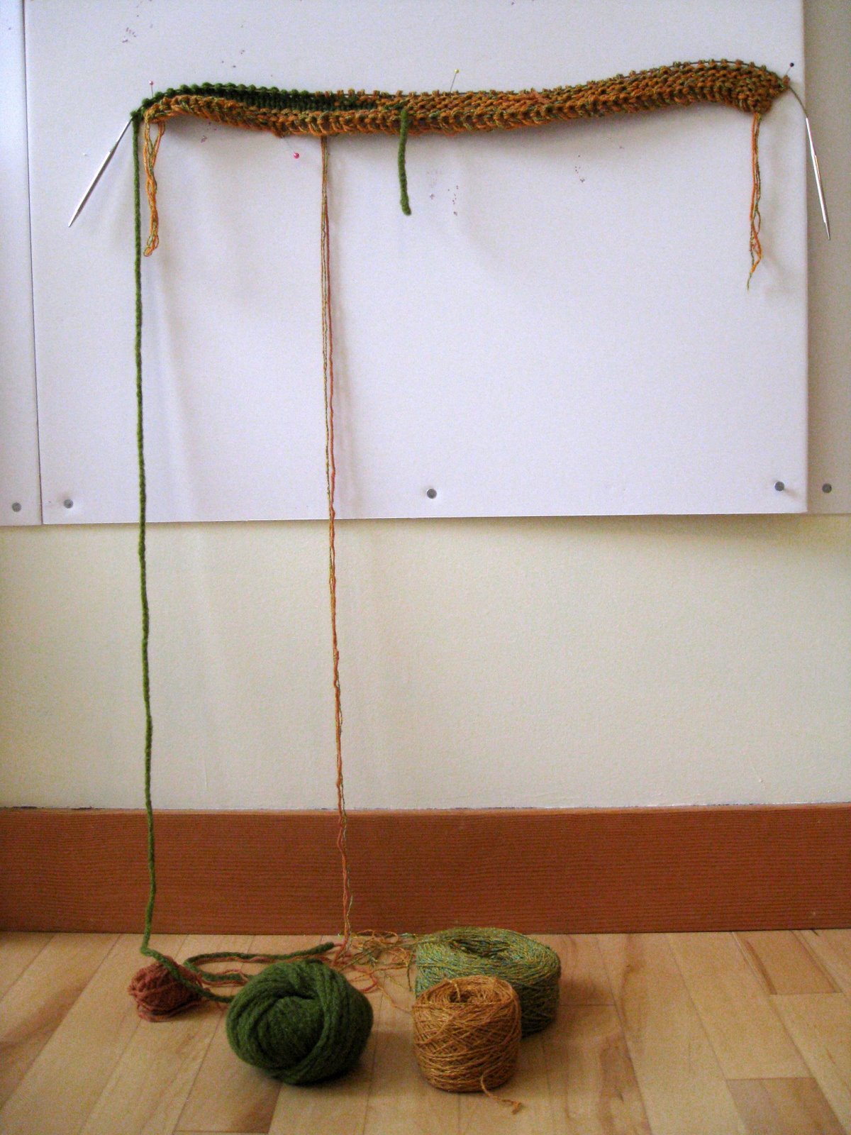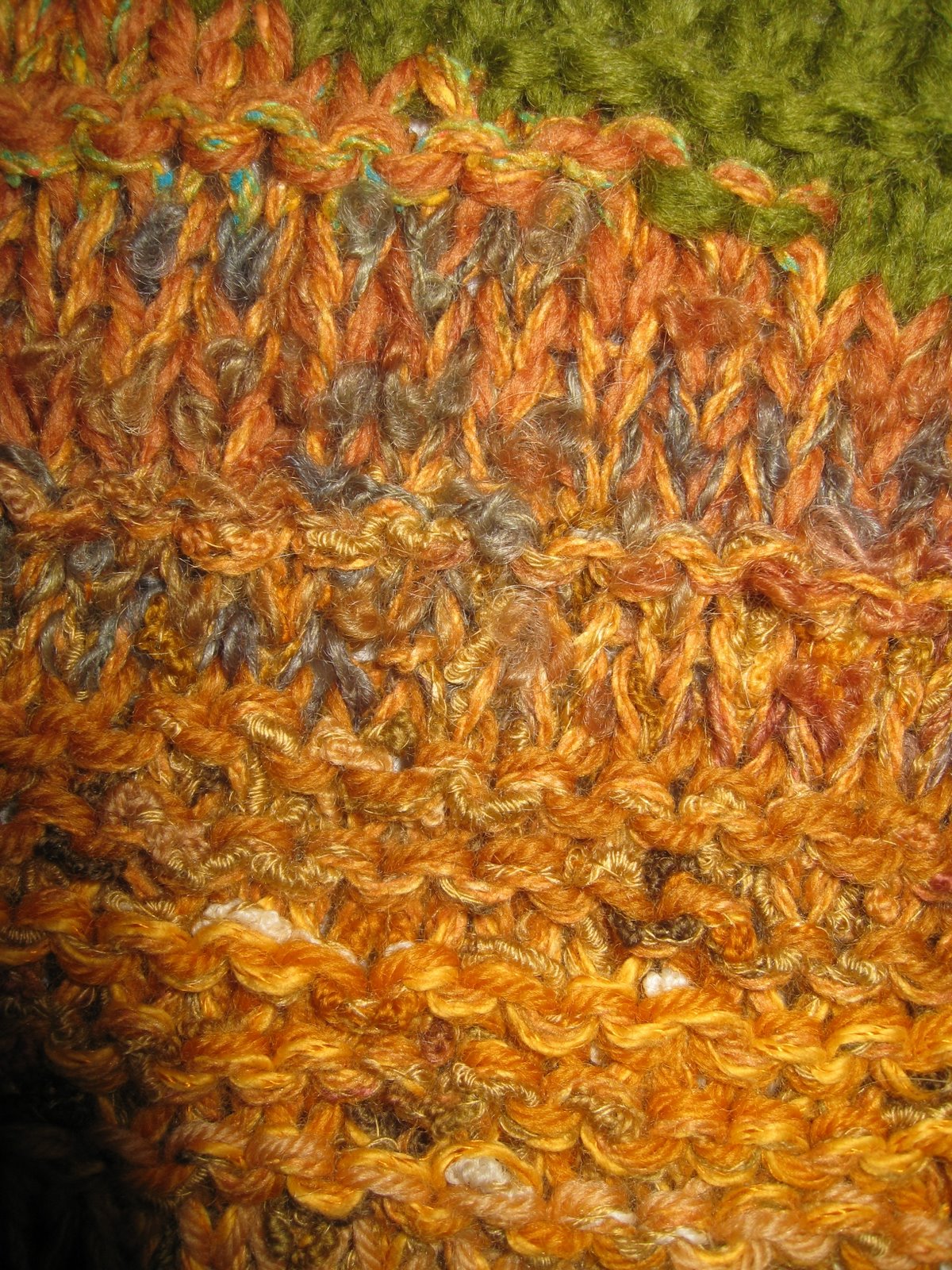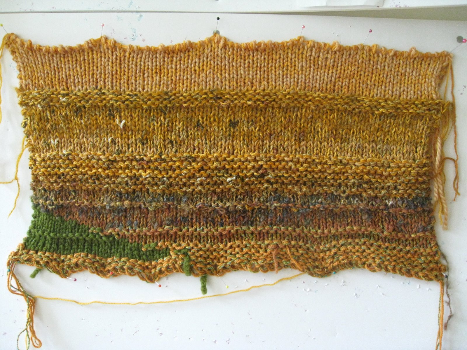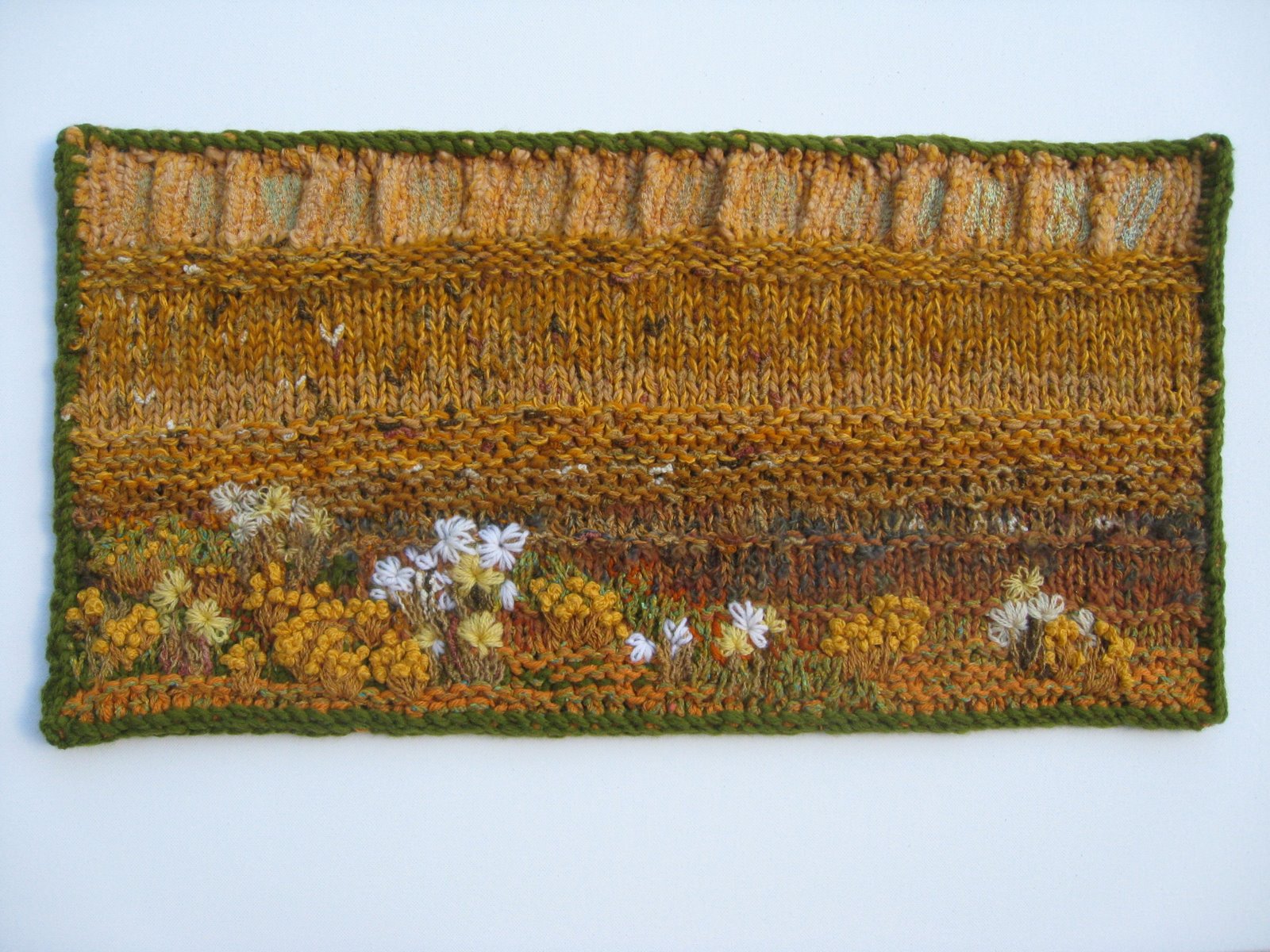 The finished work with lots of hand stitching on top of the knit ground fabric