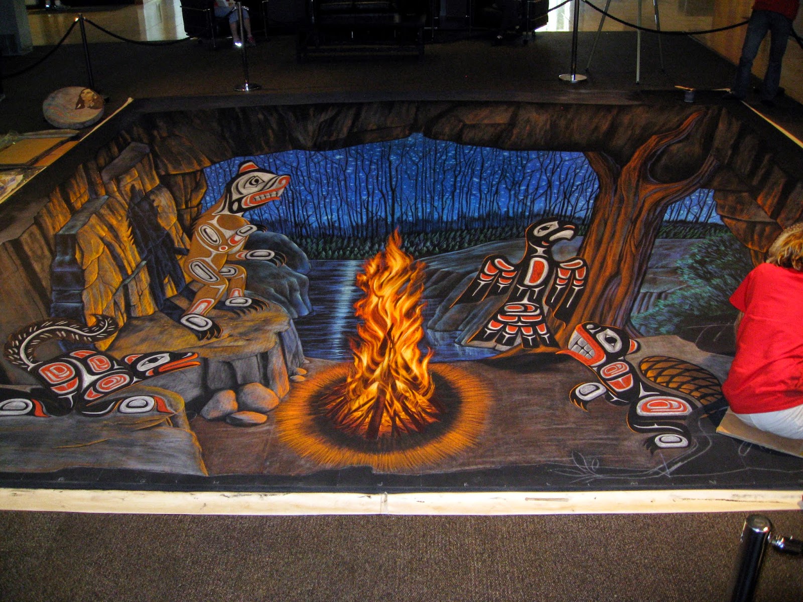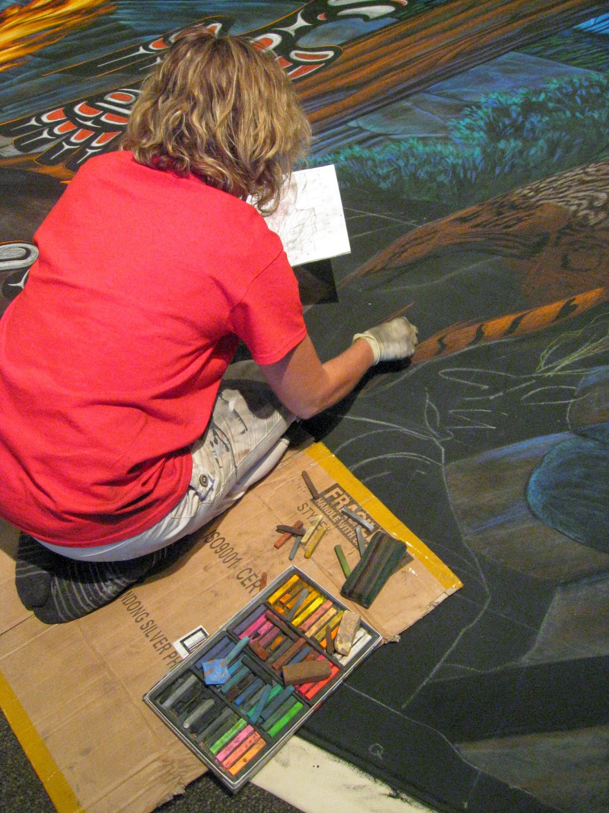 The Victoria International Chalk Art Festival is on. A large chalk drawing is being made on the floor of the museum. The distorted perspective makes it look 3D.