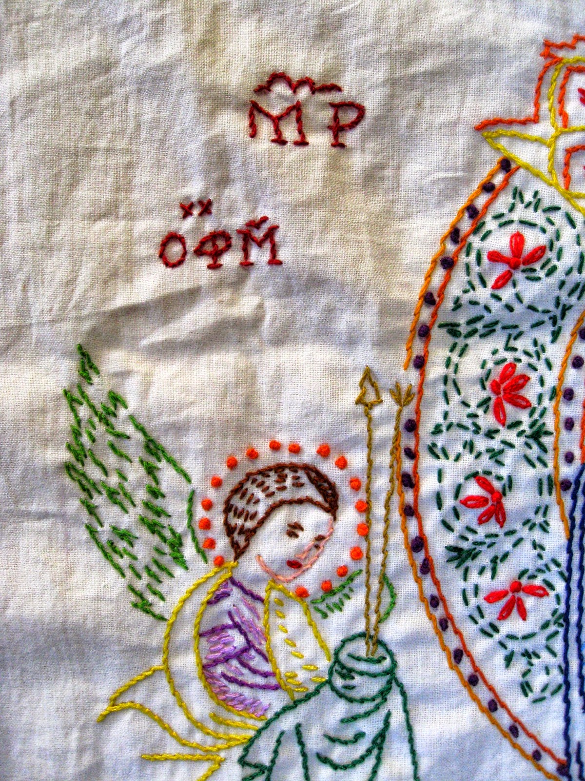 The 3rd treasure I spied in the box at the auction was this neatly worked Russia icon-like embroidery on a cloth hemmed at one end and torn at the other.