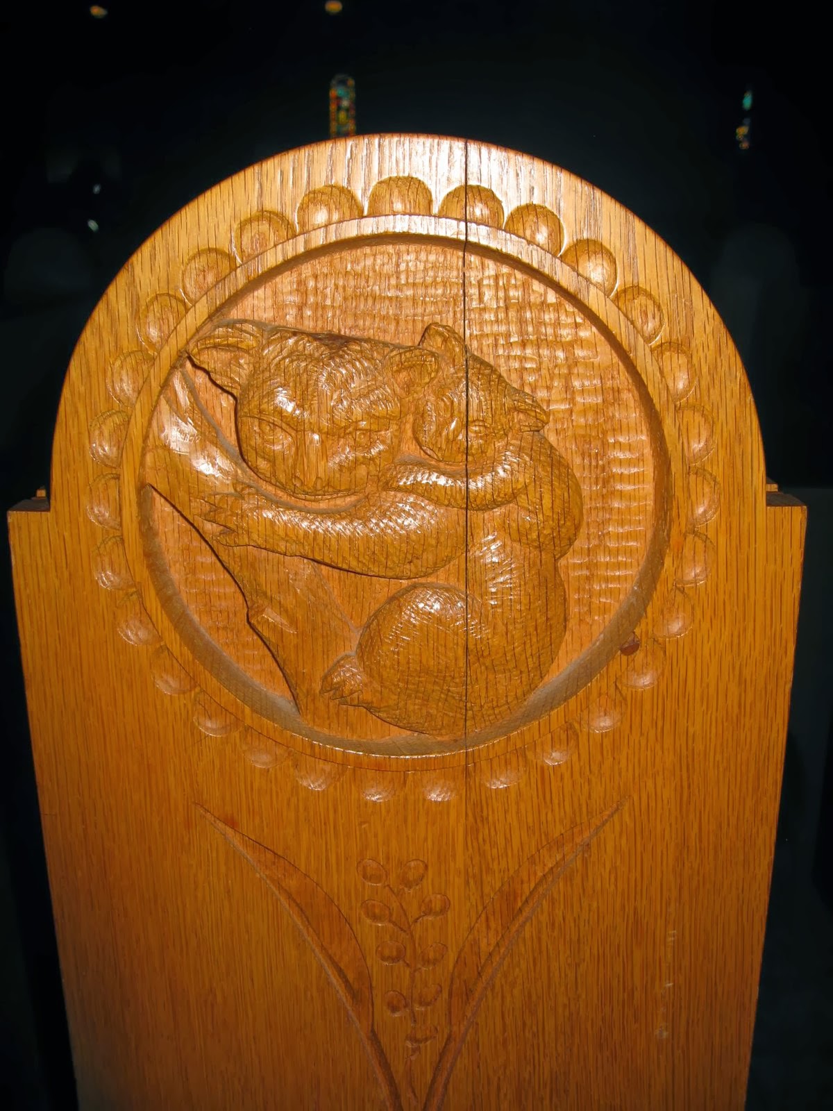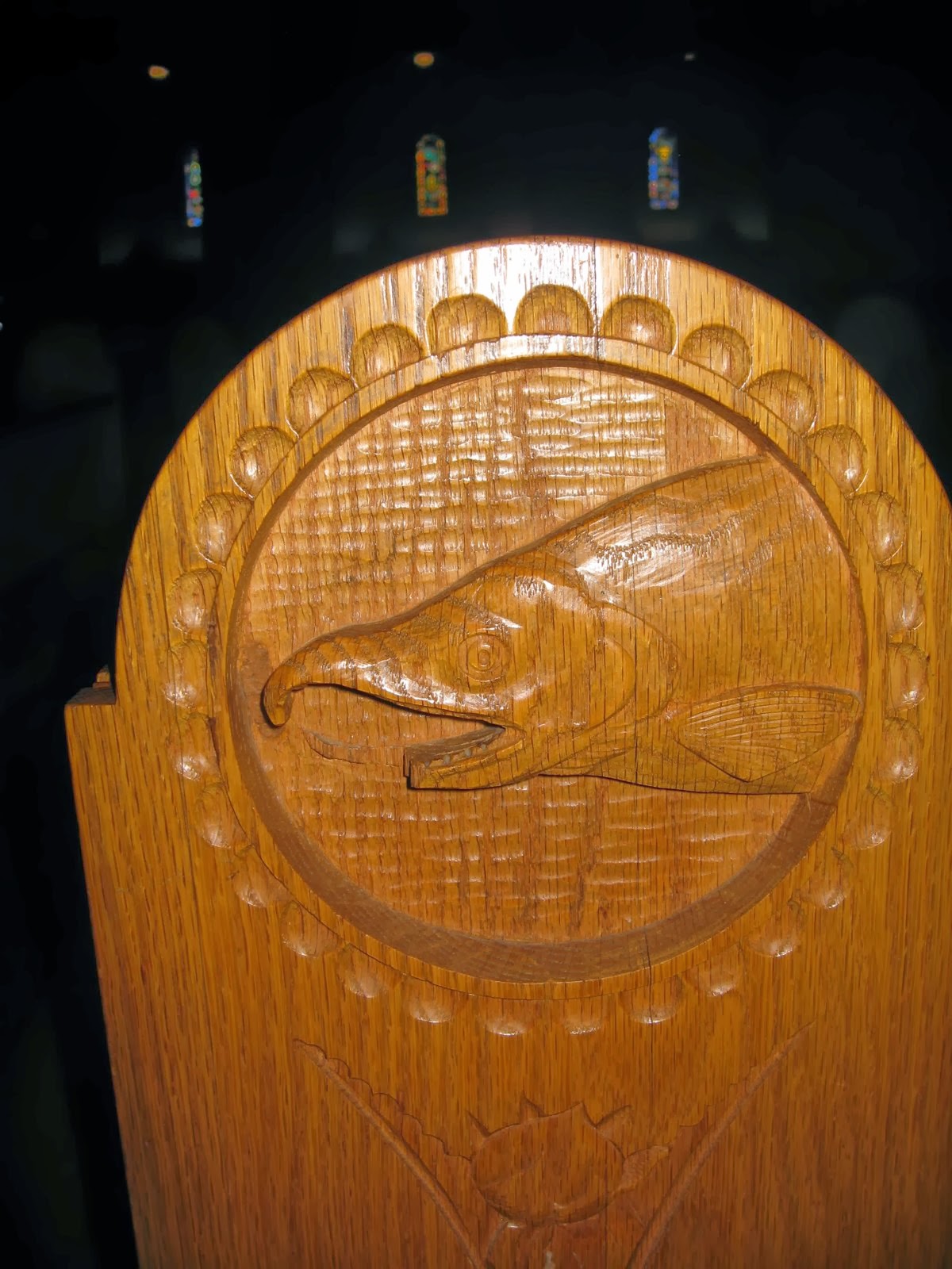 A very beautiful, subtle decoration is carved into the ends of the wooden pews.There is that triangle again,