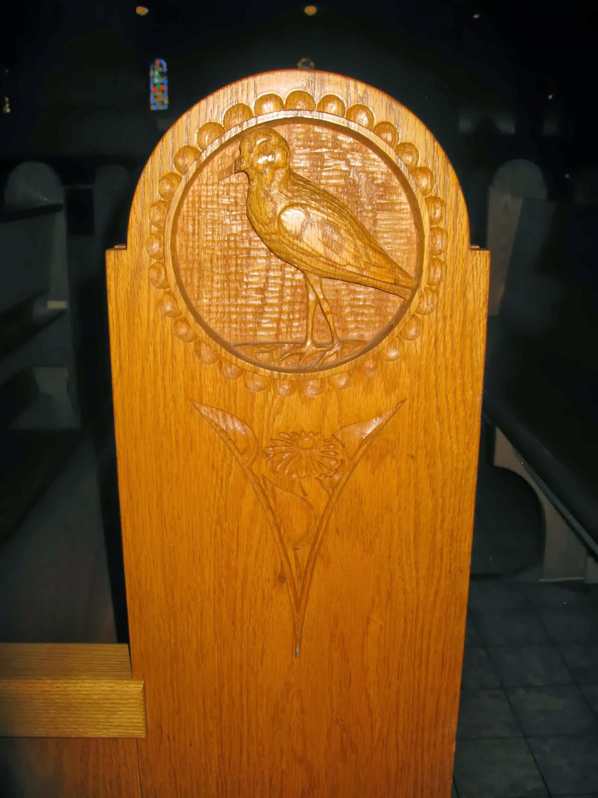 Every pew has a different animal or bird and a flower in a triangle.