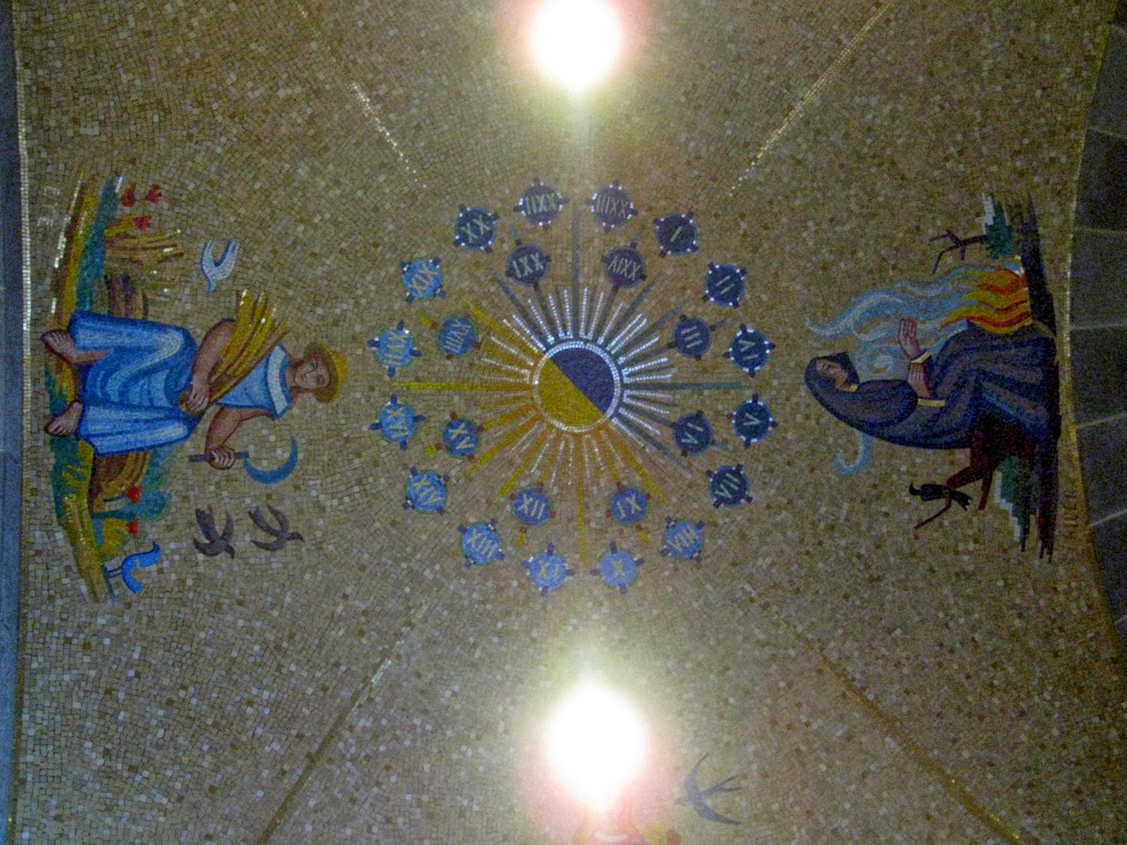 Unlike most Christian churches, females feature prominently. A ceiling mosaic: working in the fields during the day, sitting by the fire at night.There are lots of images of women with birds and flowers.