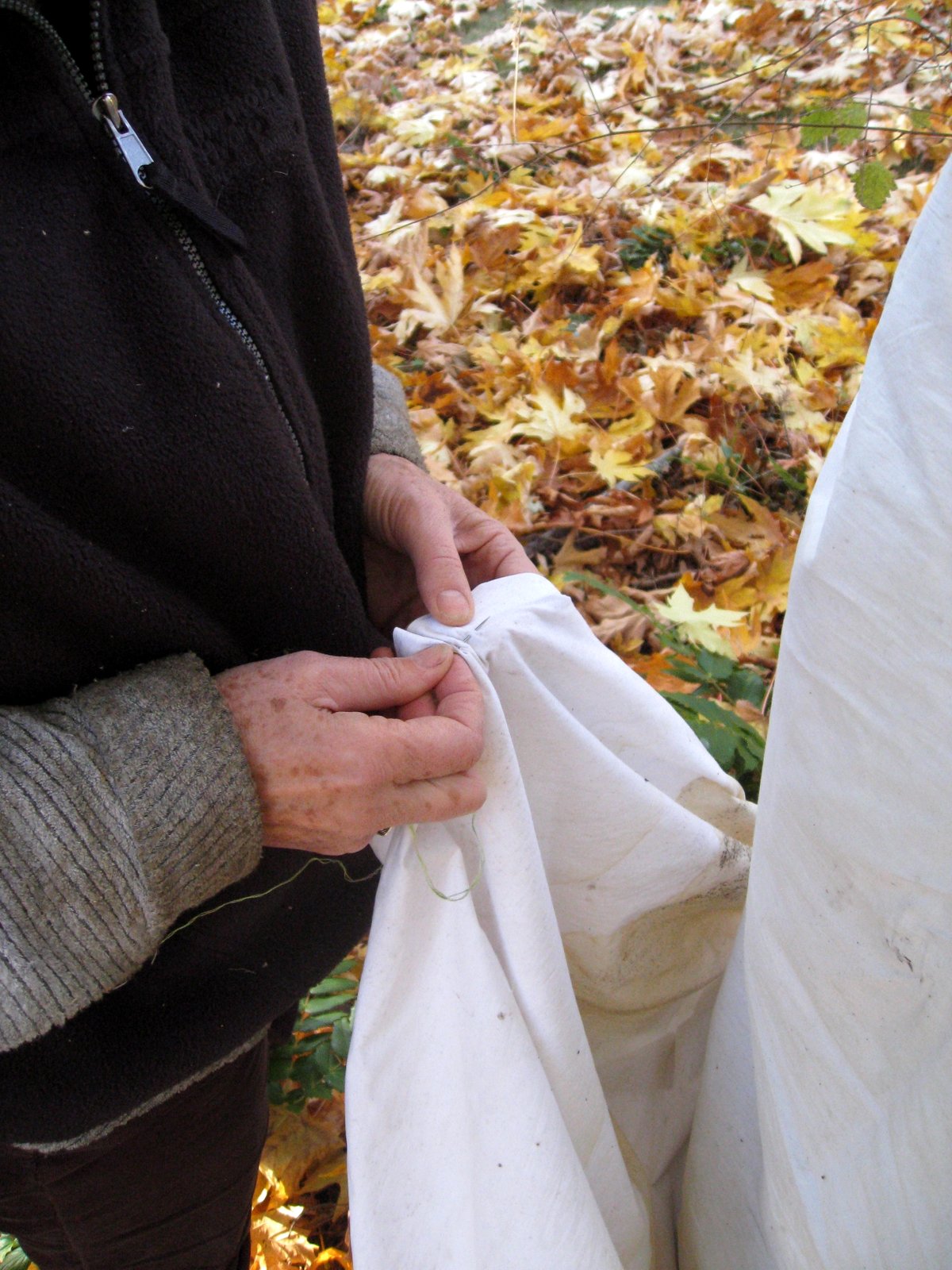 I quickly became aware of the challenges of stitching outside while the bed sheets were wrapped around the trees.I live in a "rain" forest area so the sheets were often wet. Thread doesn't slide very well through wet cloth.So no stitching when the cloth is wet.