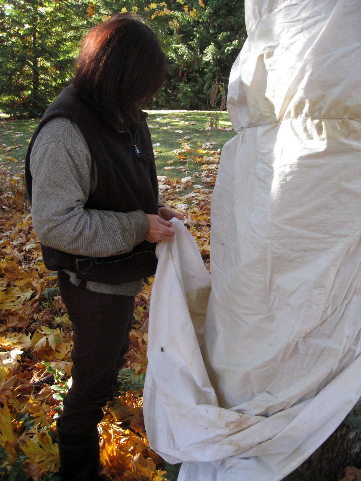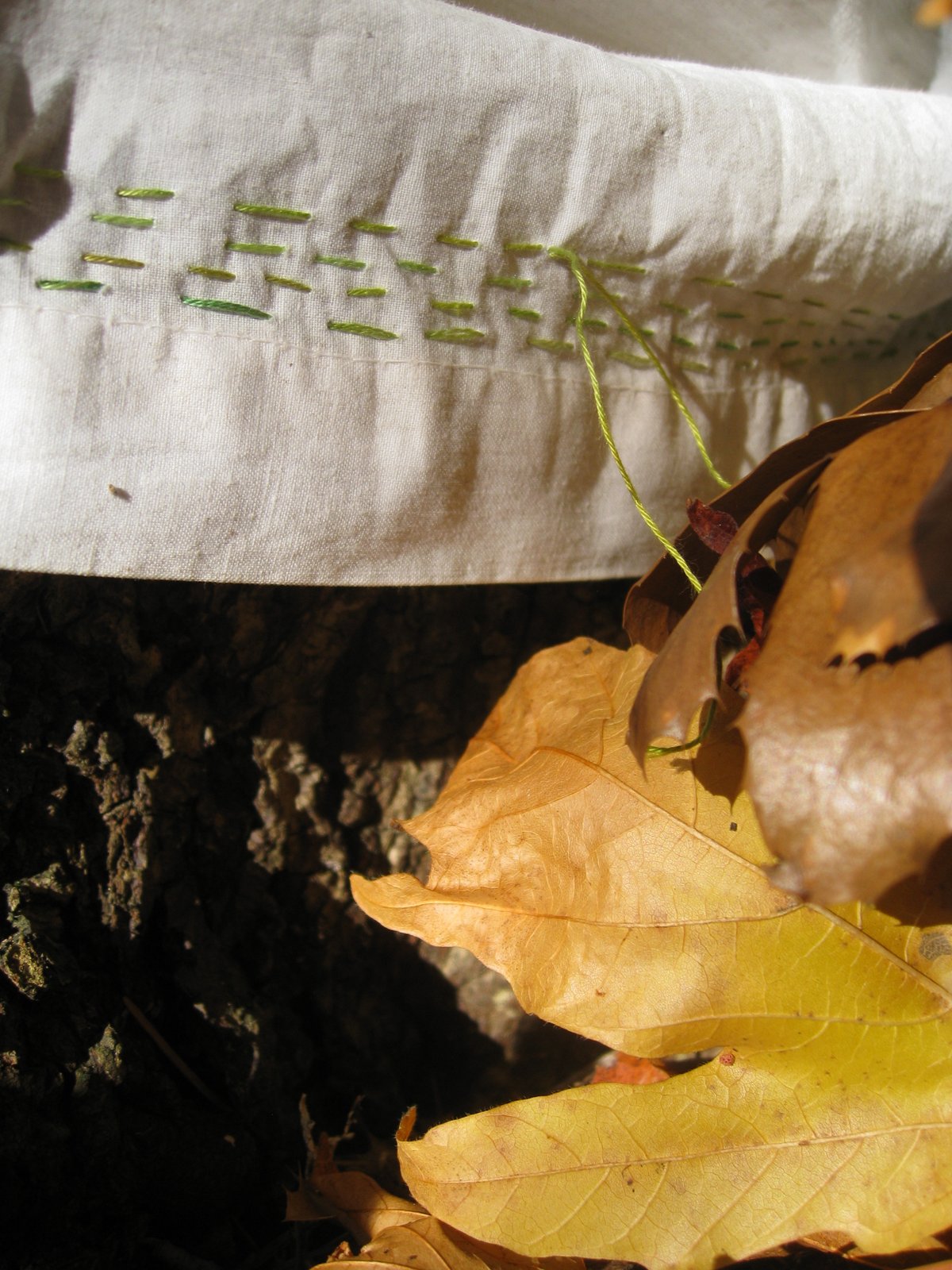 Another challenge was, apart from stitching along the bottom hem, how was I going to stitch on the sheet while it was wrapped around the tree?Having found out I could stitch only when the cloth was dry and it was above 8 degrees, I realised I wouldn't be able to stitch outside many days between October and spring. I needed to put more thought into realising my concept.
