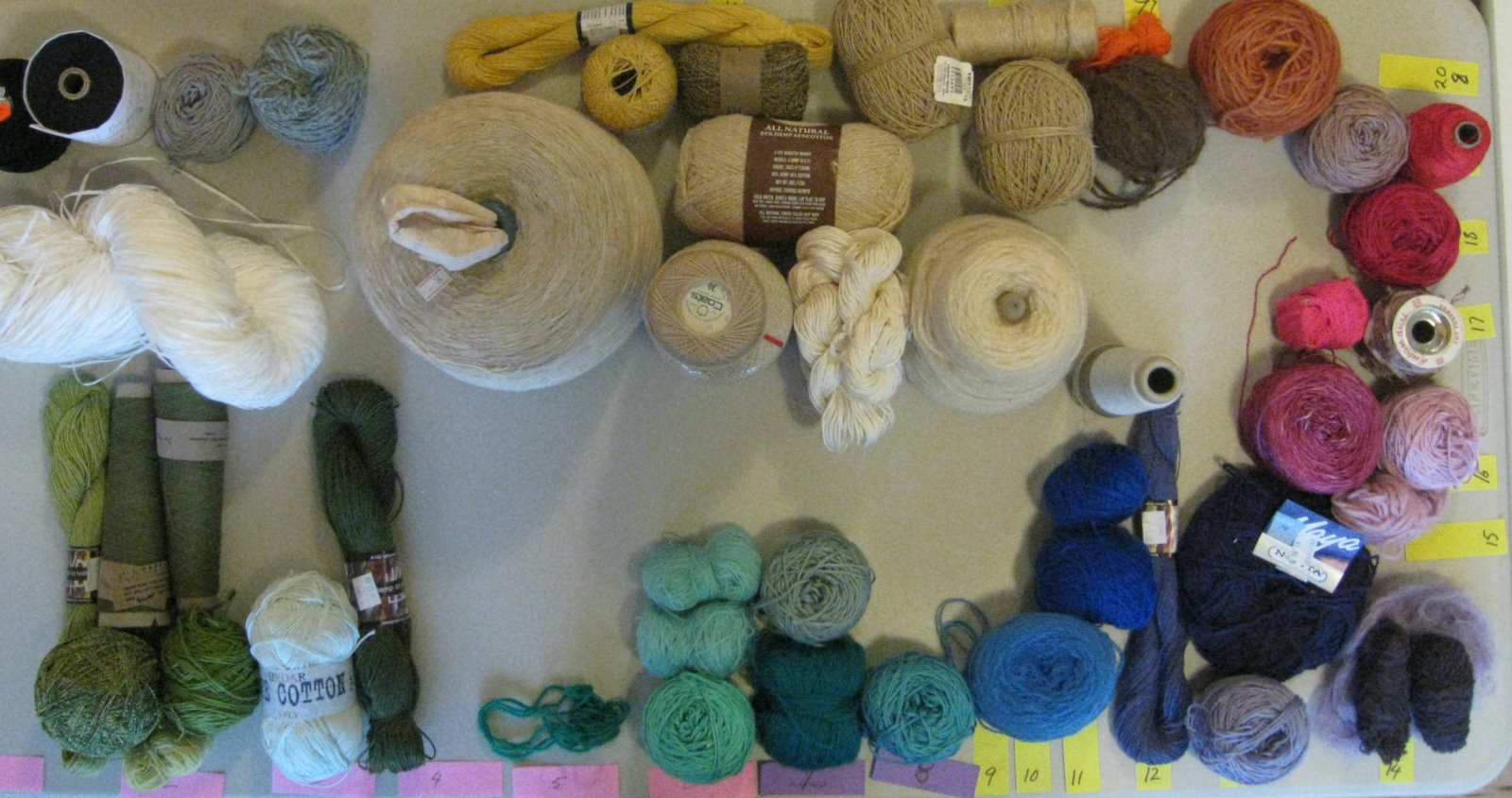 Now that i have sent this semester's module of work to the UK for assessment it is time to clean up my studio. All of the left over yarn that i had hauled out, i sorted by hue. I have all of my yarns and threads sorted into 24 different hues, each with their own box. I call these boxes my palette. i find sorting yarns like this helps keep my eye for colour in practice.