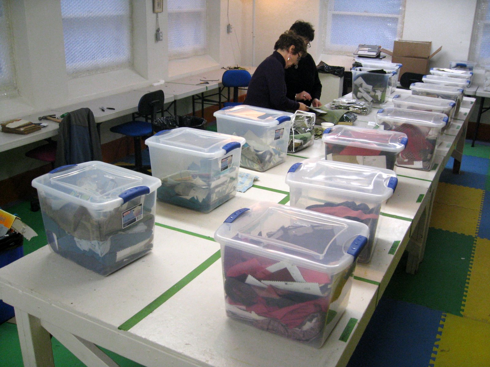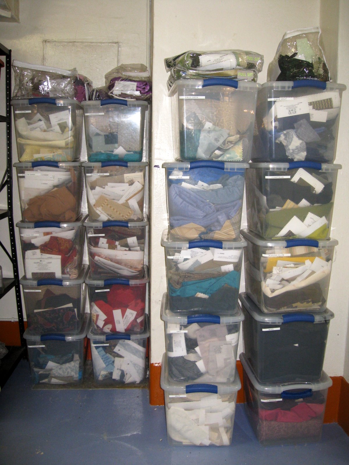 After fabrics were sorted by hue they were put in labelled boxes....