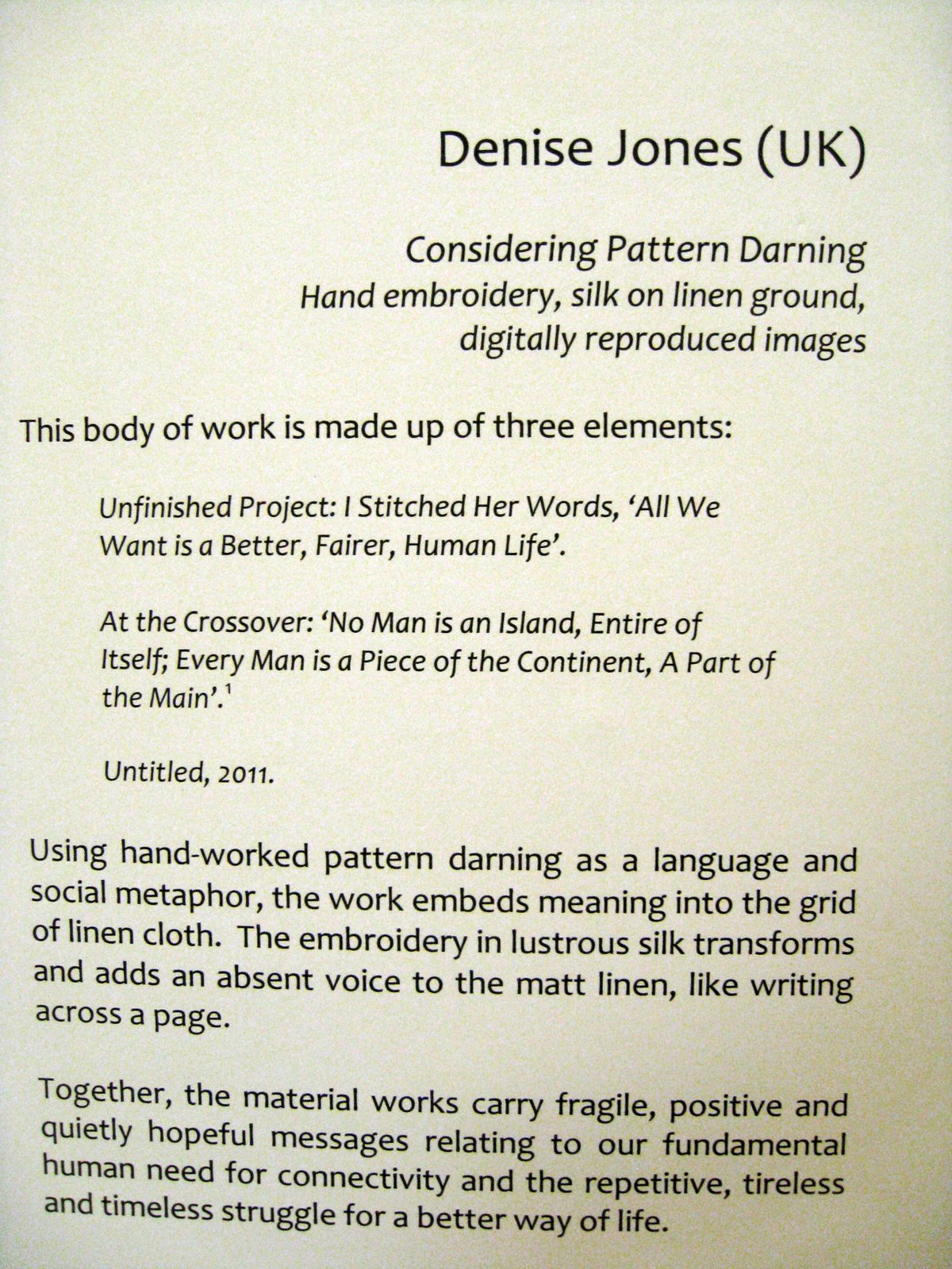 I felt the stitched works stood out more on the red brick walls but didn't invite the close attention of the viewer as did the white walls in the Middlesex gallery.