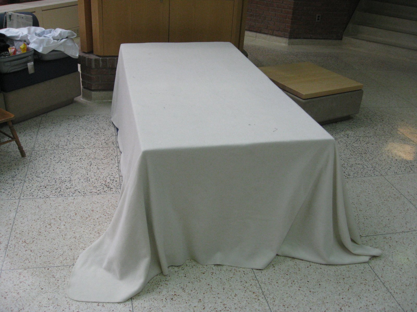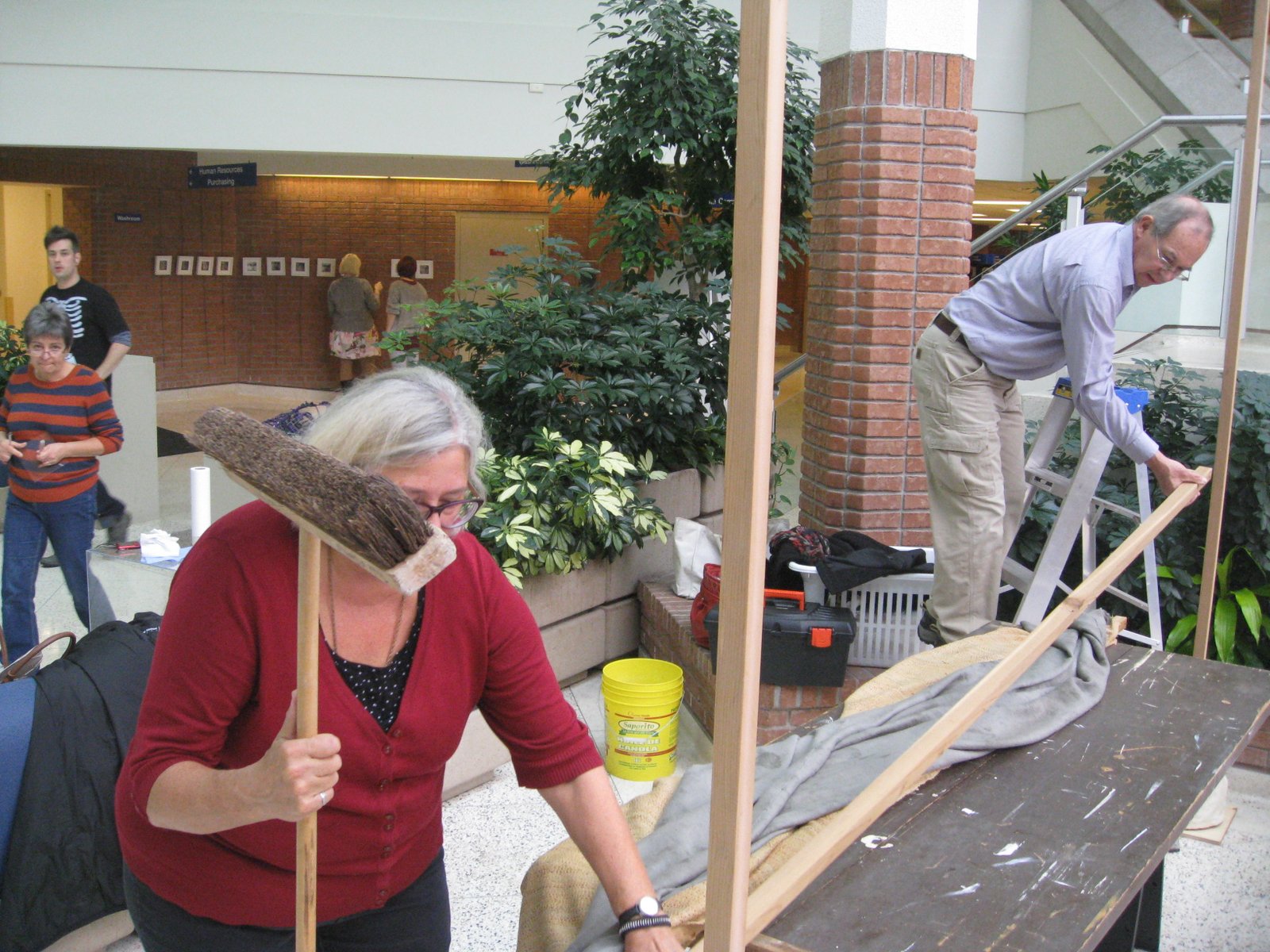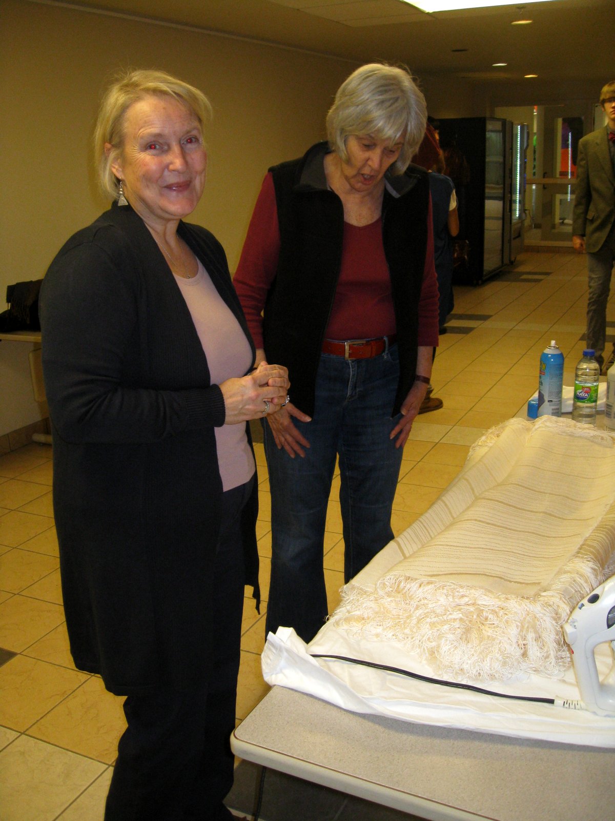 Monika Brueckner installing her work, with a World of Threads Festival volunteer, June, looking on.