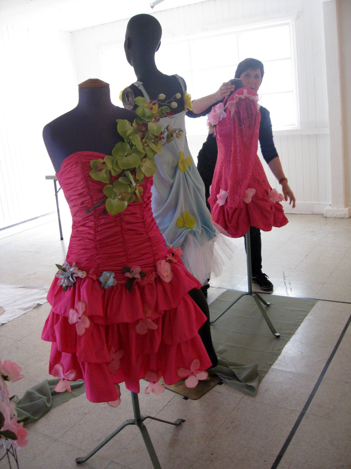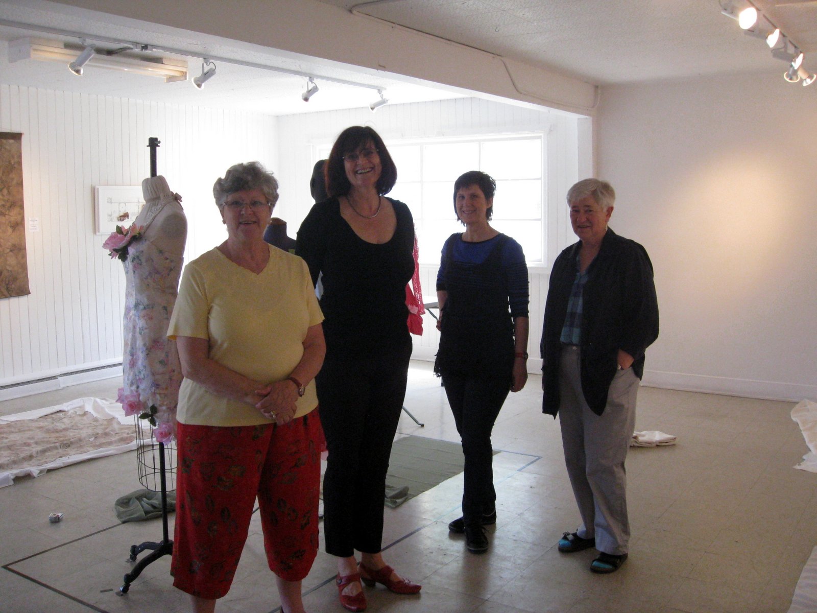 Here is the Hanging Crew for the Vancouver Island Surface Design Association Current Threads III: Re-Surfacing exhibition in the Slide gallery at Vancouver Island School of Art.Morag Orr-Stevens, me, Margie Preninger, Gillian Smith