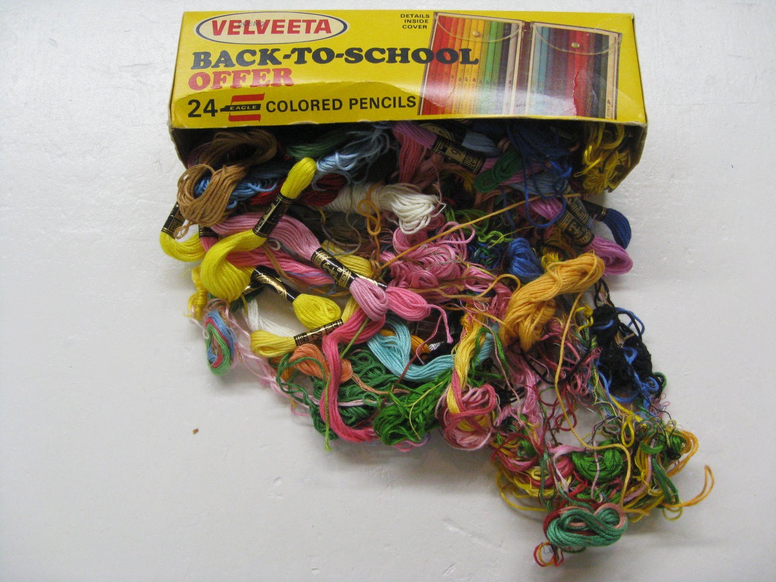 Barbara donated this delightful collection of threads in an old Velveeta box. They look as though they have been treasured for many decades and now the students will put the threads to good use.