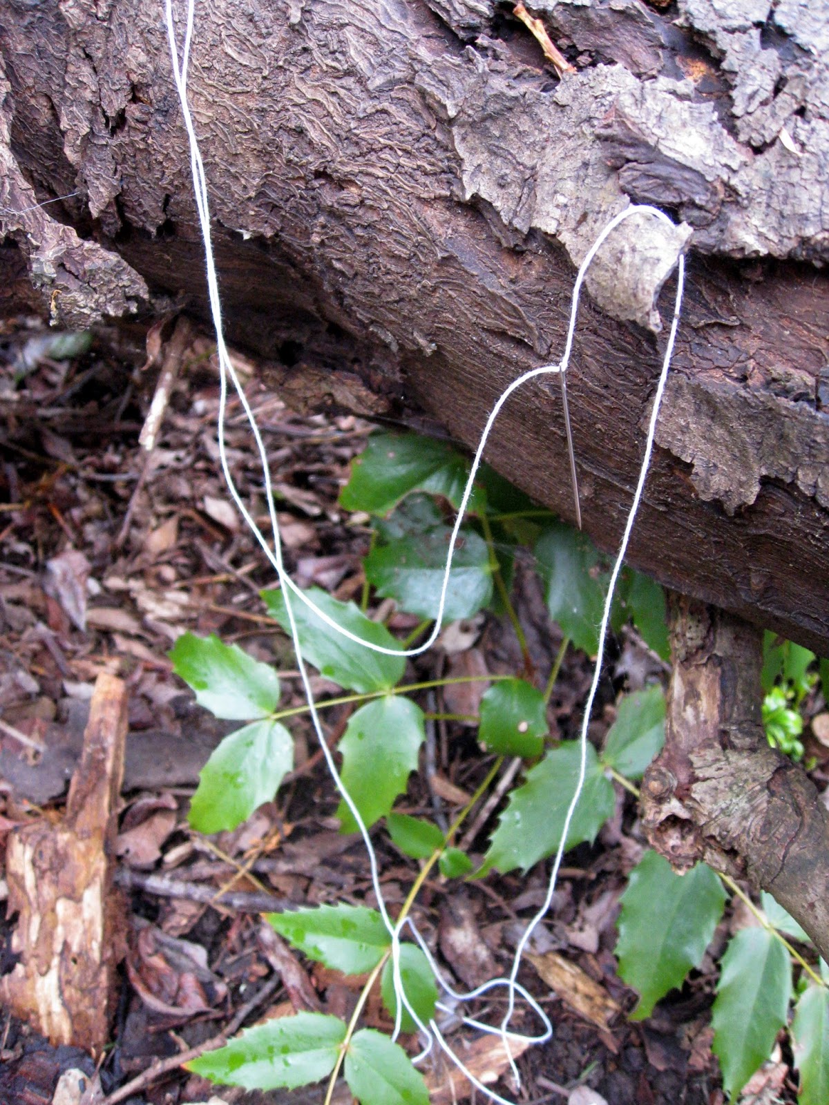 I ran inside to get another needle after I had given up searching in the deep layers of moss and decaying leaves. When I returned with another needle I found my first one hanging by a thread - ties in with that vulnerable feeling again.