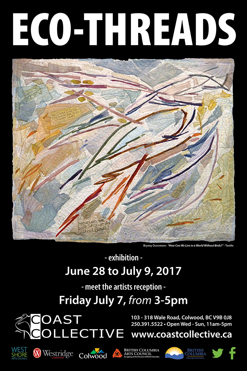 Eco-Threads is a juried exhibition put on jointly by Vancouver Island Surface Design Association and the Coast Collective in Colwood, on from June 28 to July 9, 2017.