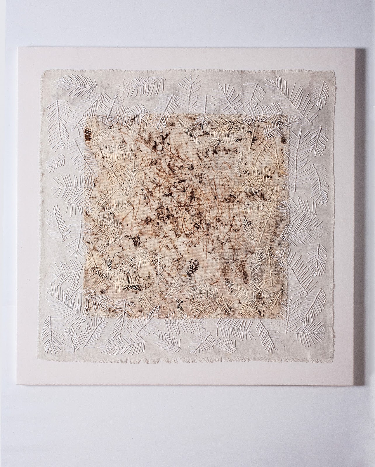 It is about a Douglas-fir tree in our back yard. The middle part is a drawing done in ink by a branch of the tree on a windy day. The different fabrics are from old bedsheets. The middle one was composted under the tree canopy before being drawn on.