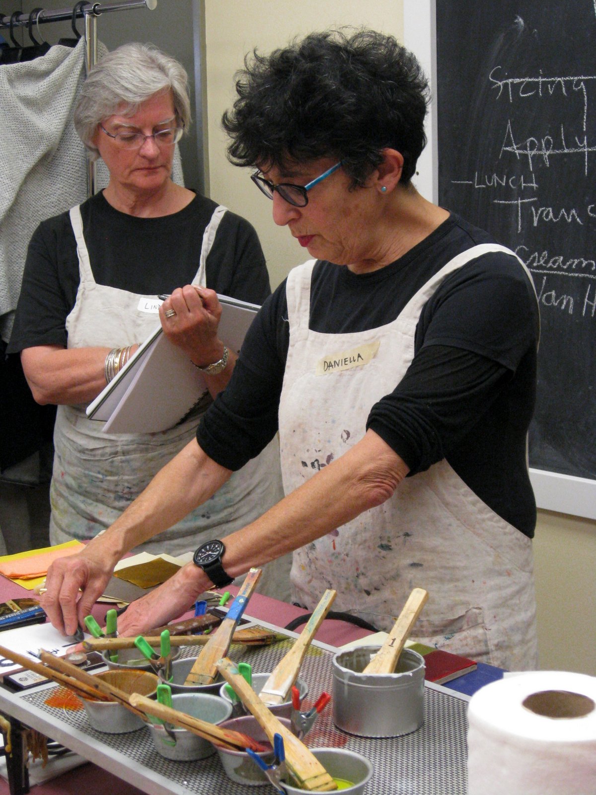 On day 2, while waiting for Daniella Woolf's next batch of demos, I continued to add and scrape back layers of clear and pigmented wax on my Day 1 panels.