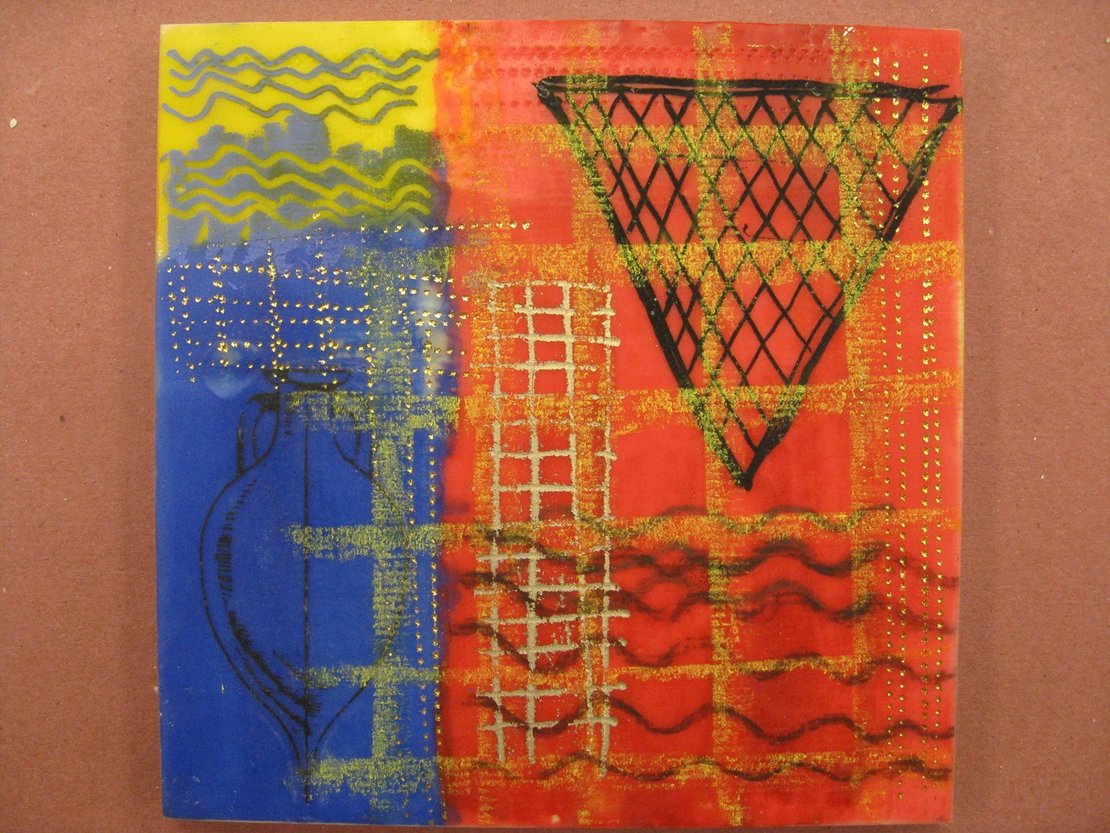 This sampler panel demonstrates different techniques and media for marking the wax surface.Day 2 was filled with learning and exploring the encaustic medium.