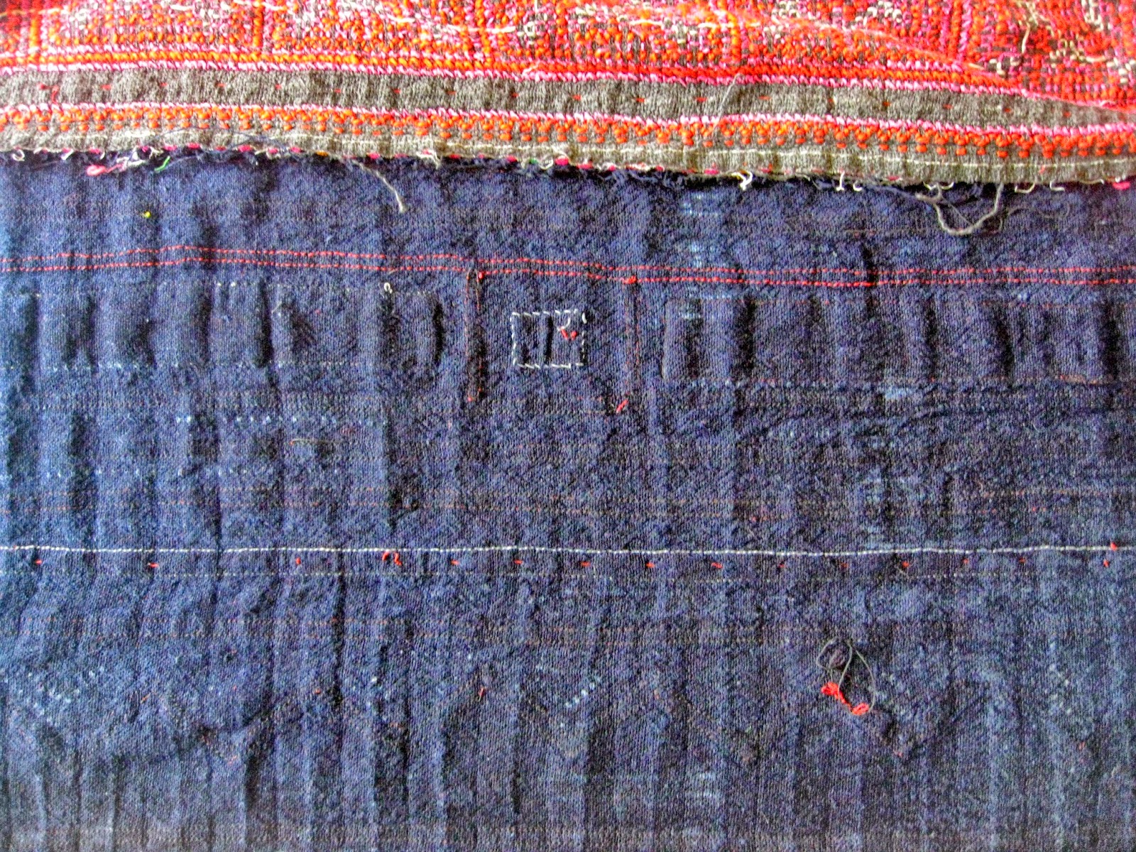 The top part of the image shows how a solidly cross-stitched band has been attached to the appliqued indigo fabric.