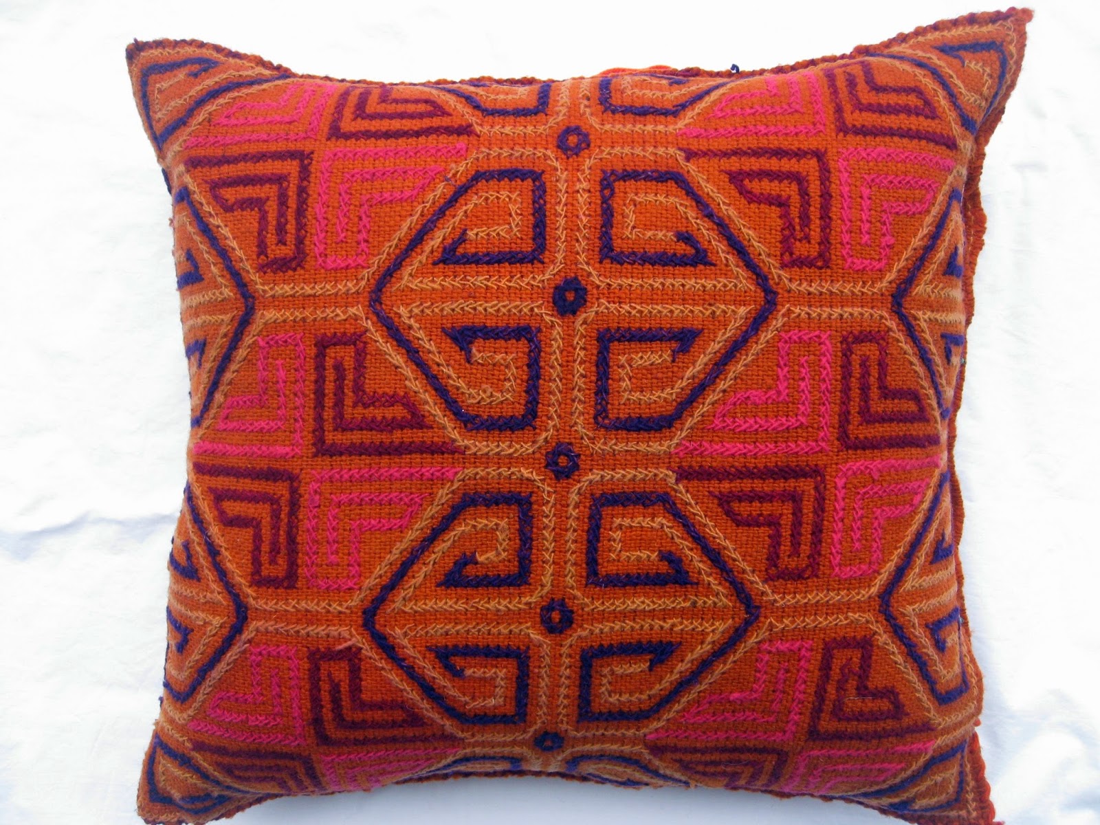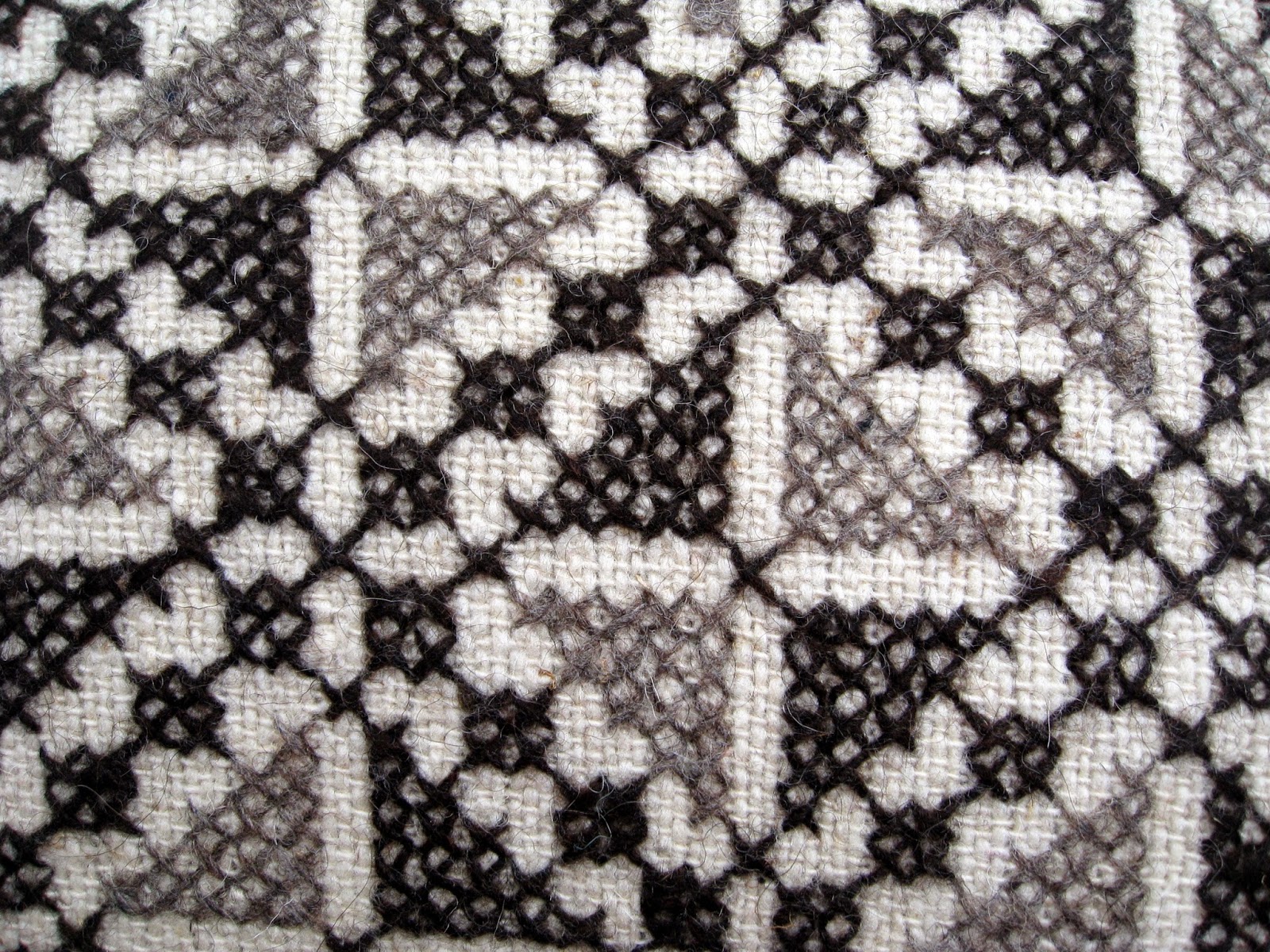 Hand spun, hand woven wool fabric is embroidered with wool in geometric, counted cross stitch designs.
