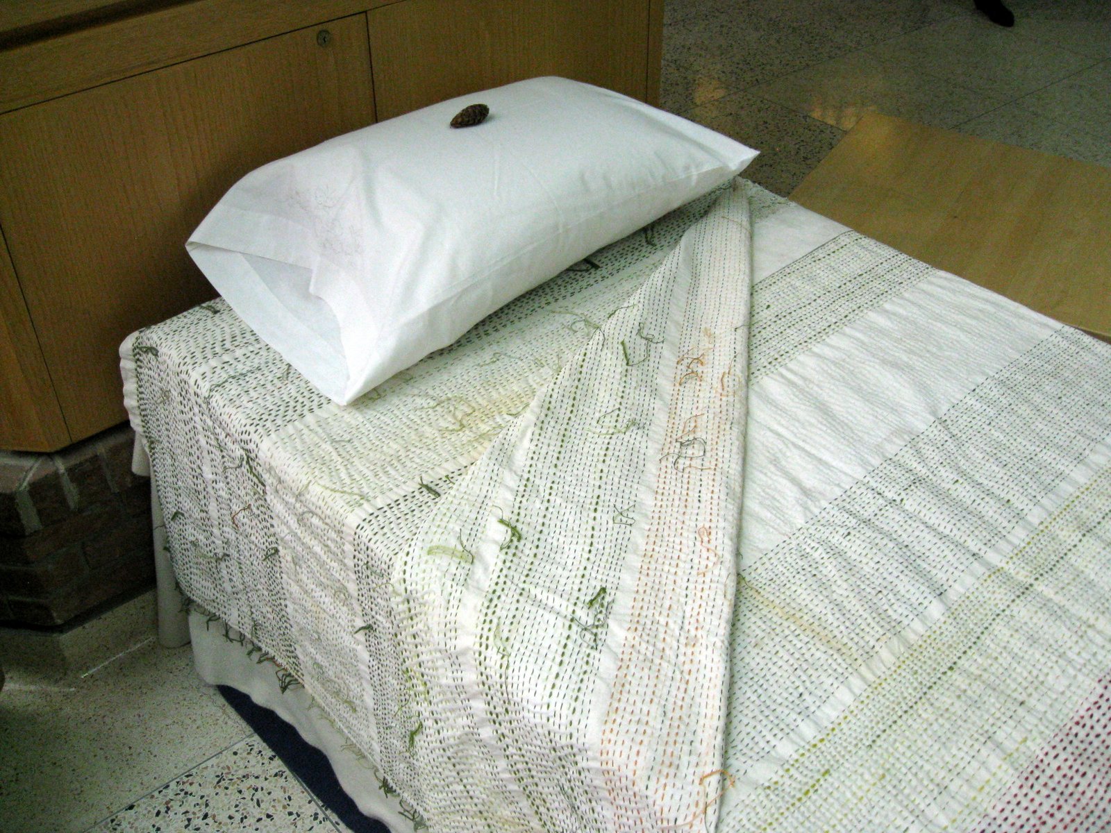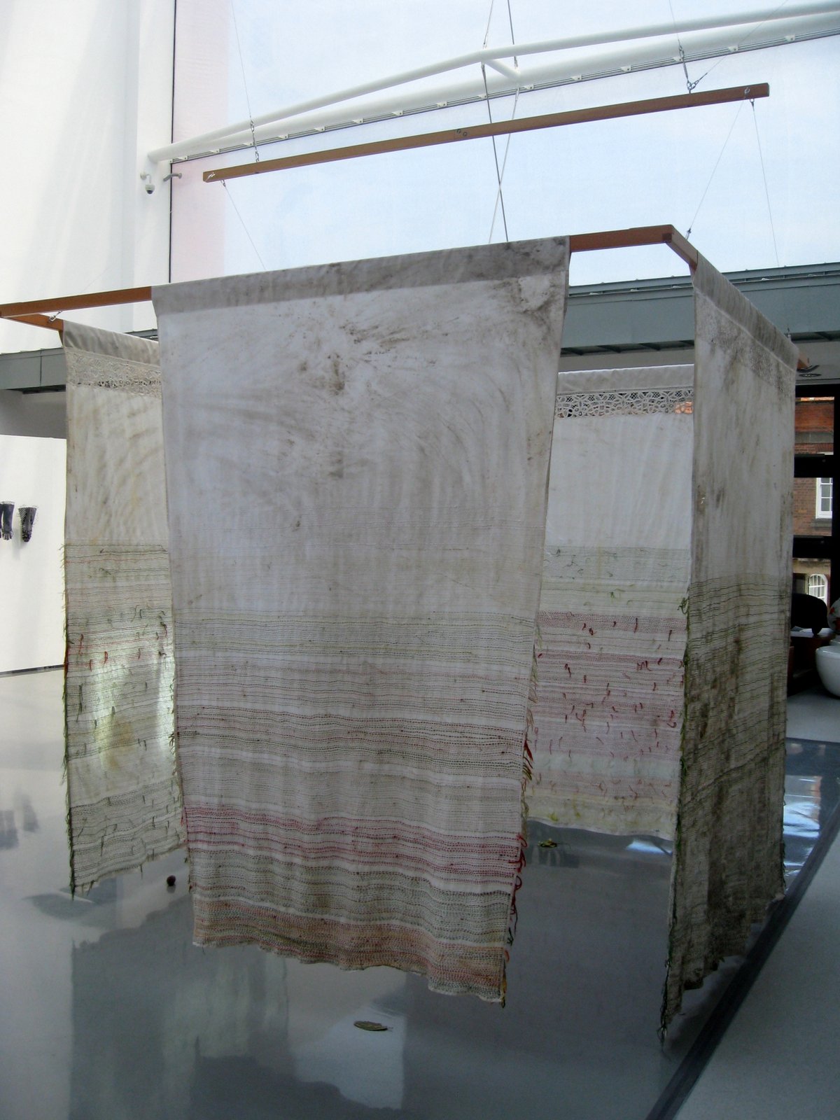 This installation was also different in that the stitching on both sheets is complete. One year of each tree's biological processes has been recorded chromatically on cloth.