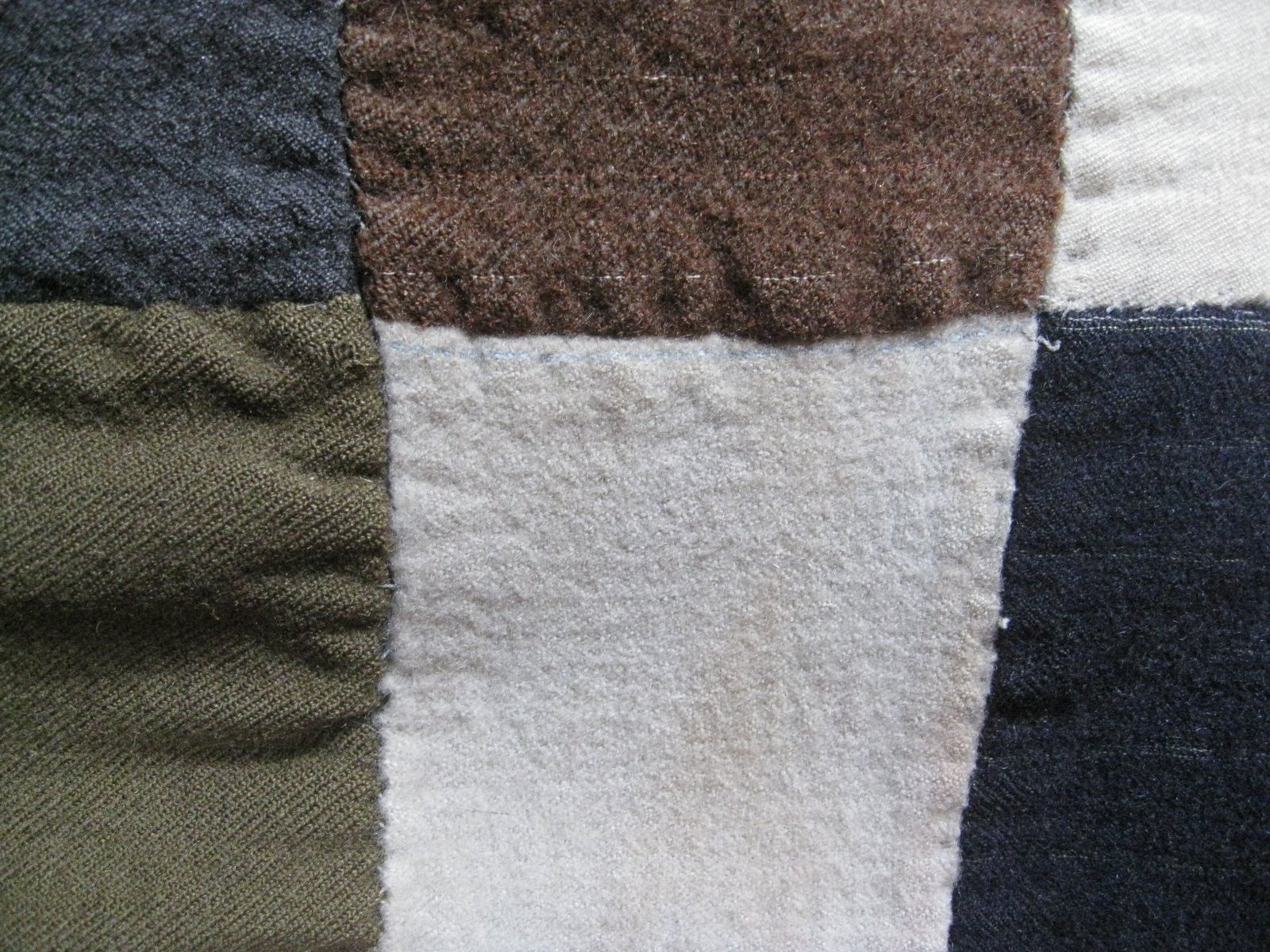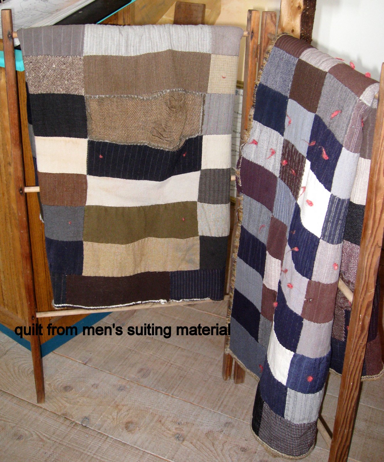 The quilts appear to be made from woolen clothing, particularly men's suits.