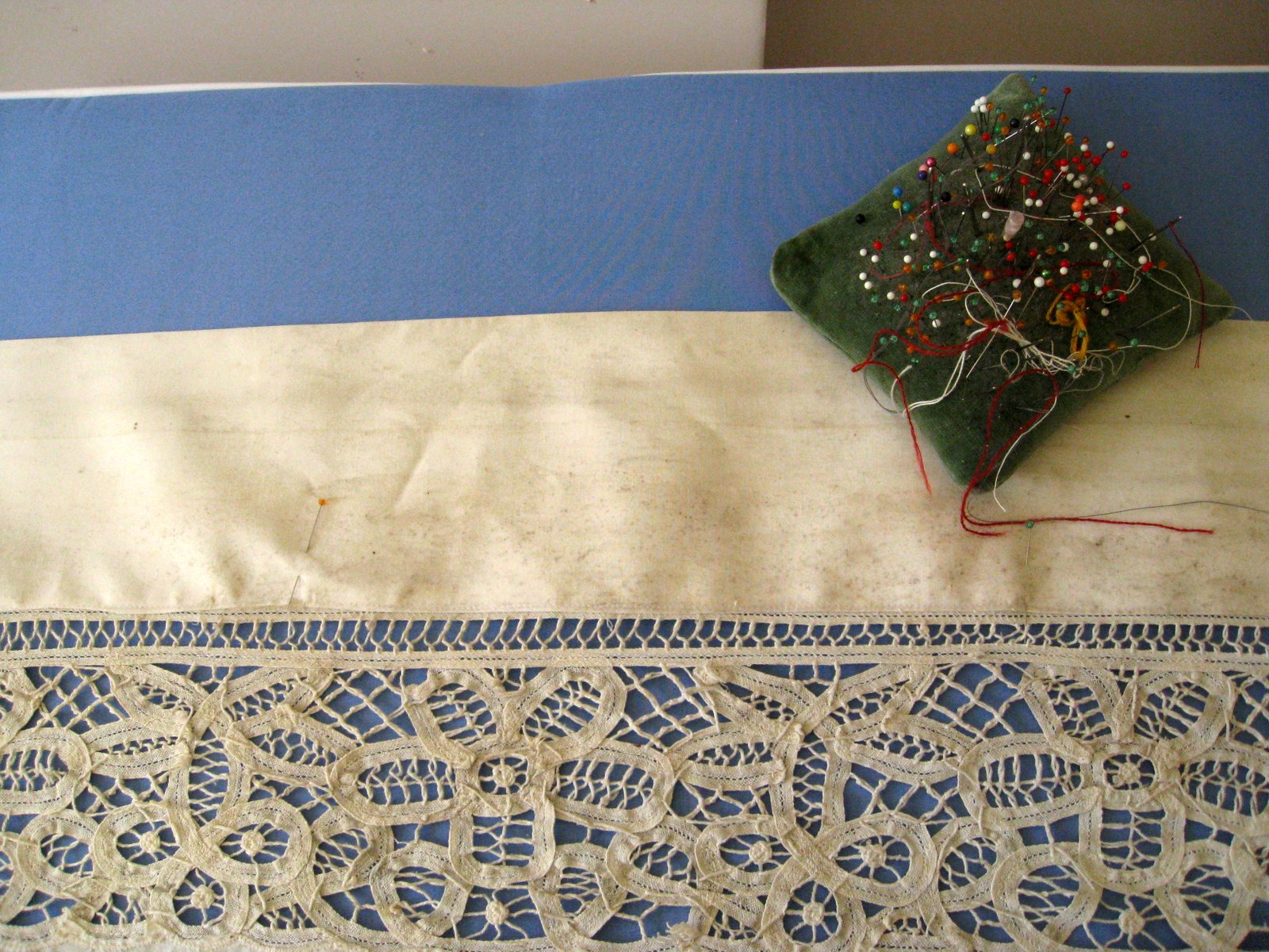 Also, the hem fabric is so fragile in its decayed state I doubt it would support the whole sheet for long. I opened up the hem and reinforced it with interfacing and sewed it back making it larger.