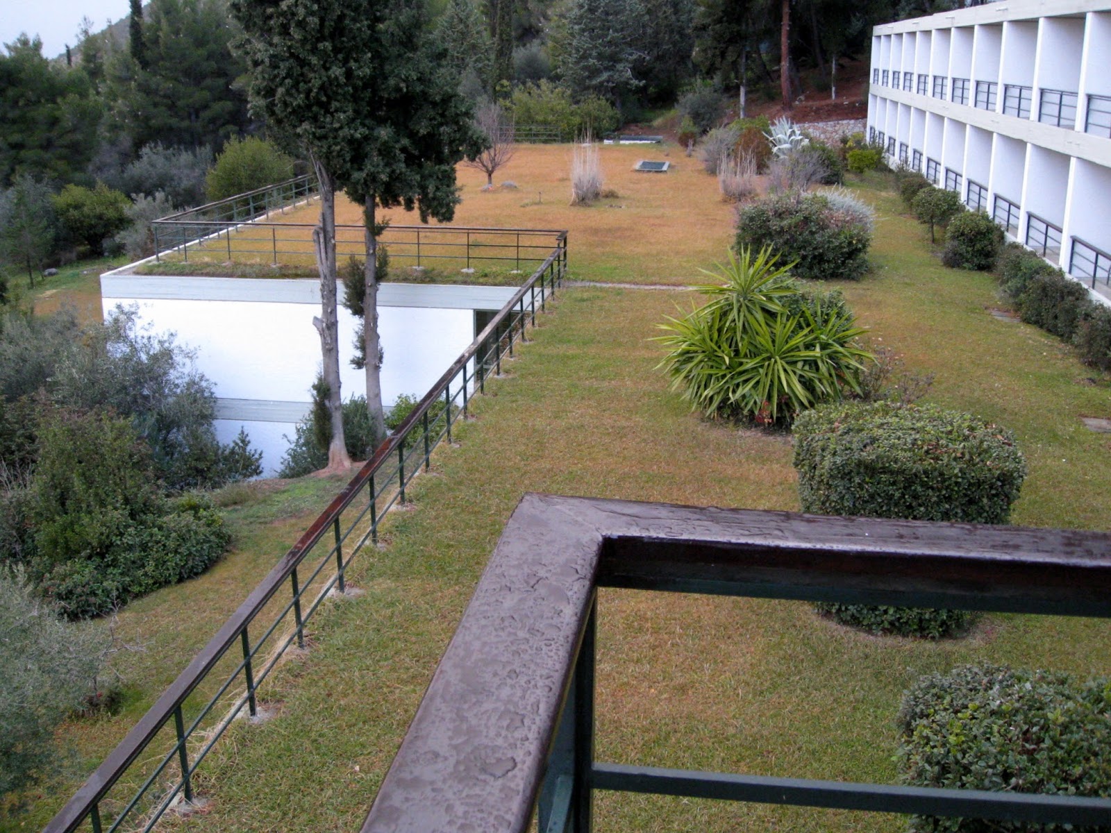 The grass and shrub filled, flat, green roofs were way ahead of their time. But this 1964 design may be referencing a feature of traditional Greek architecture.
