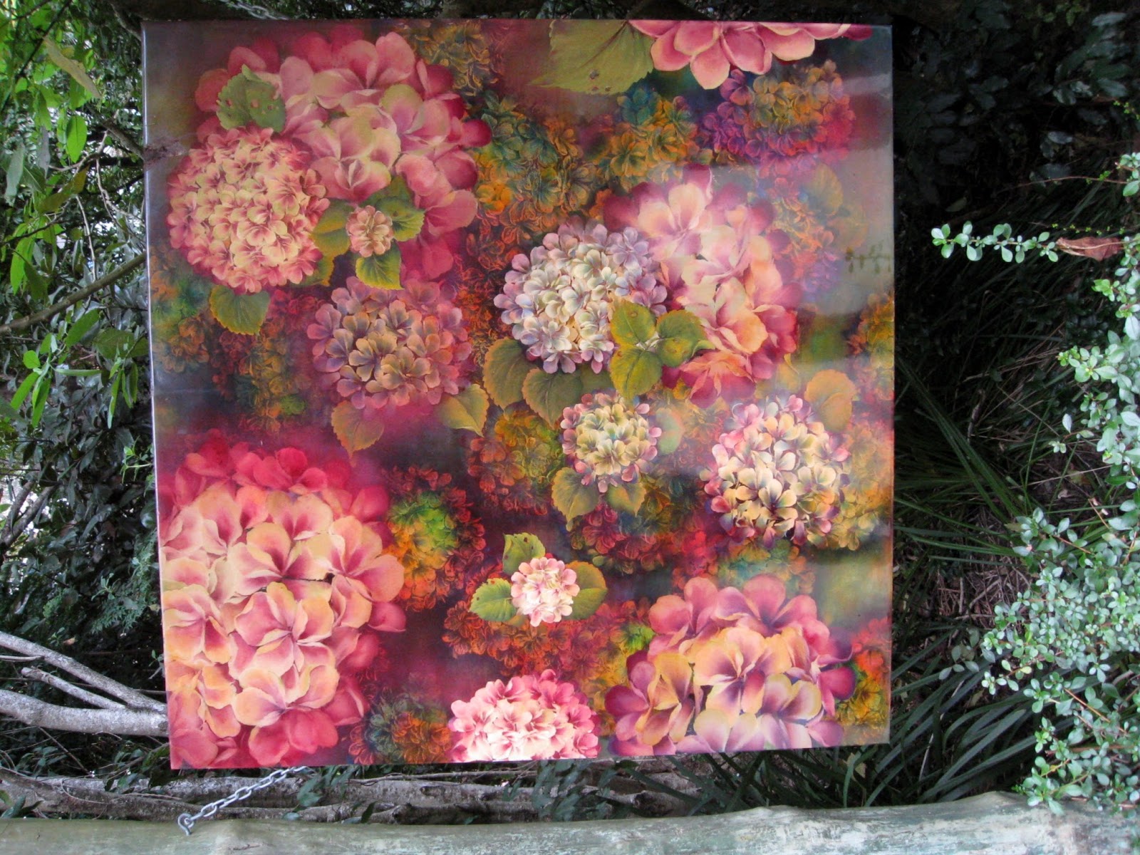 Large-scale hydrangea paintings with their glossy highly decorative metal surfaces covered in acrylic and resin are larger than life and draw the viewer in.