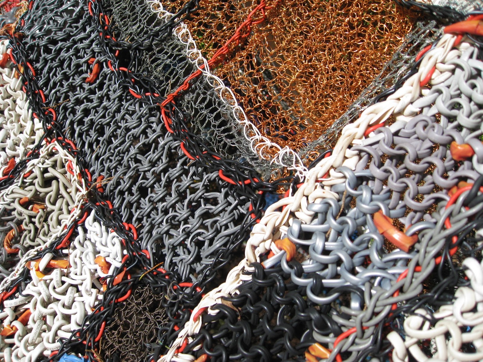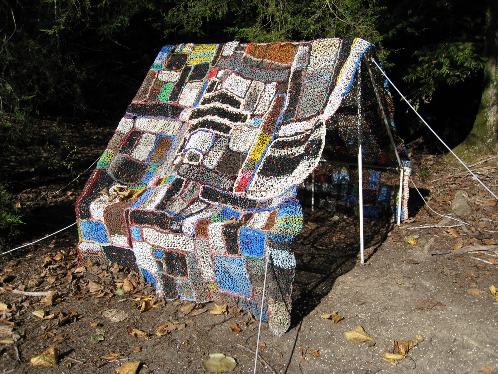 Margaret remembers childhood summers spent sleeping in a pup tent in the back yard and playing beside the sea. She feels sad about how these activities are now polluted by the huge amount of dumped waste from the telecommunications industries. She knit the tent from this waste.