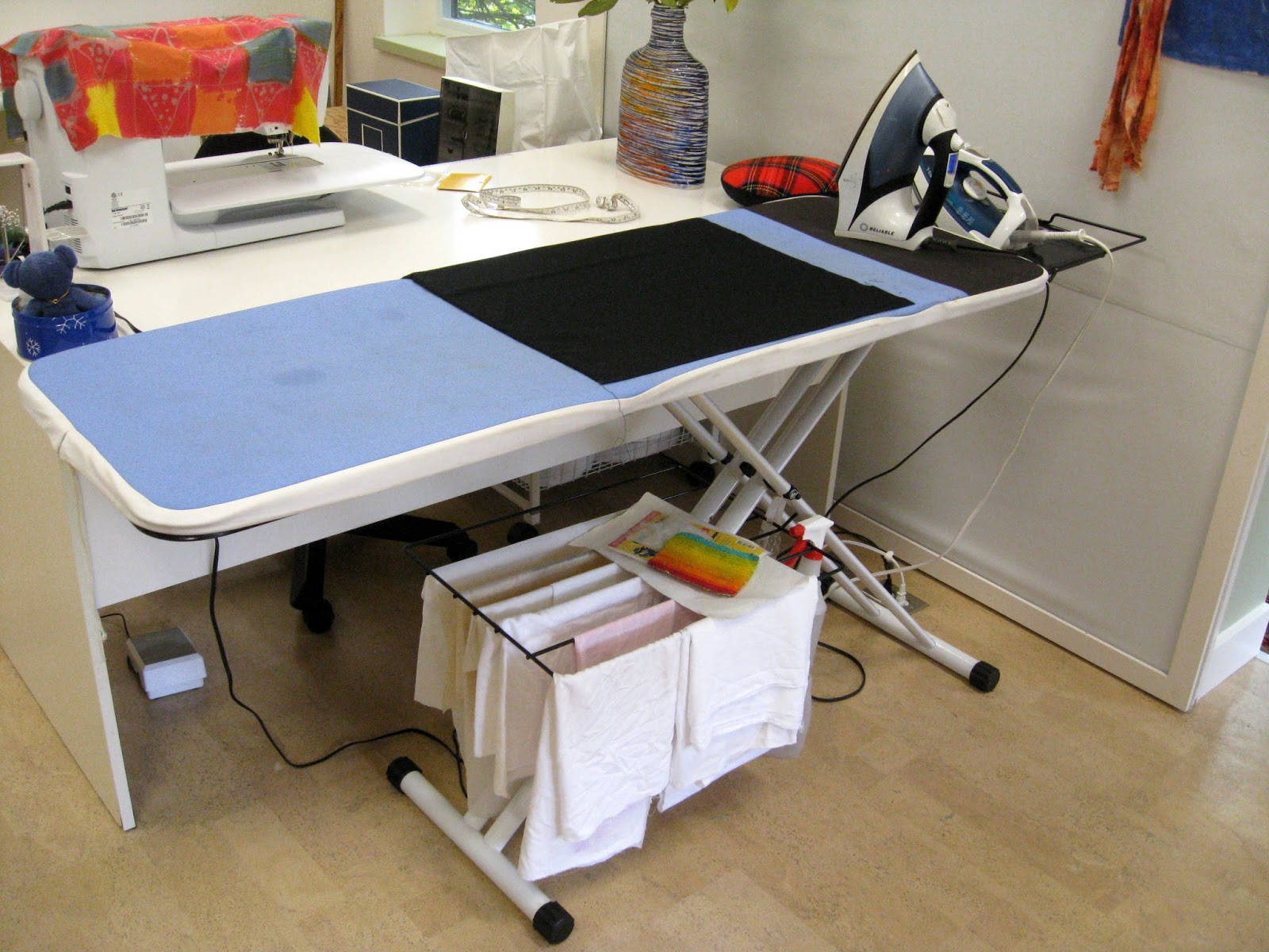 The ironing board has an extension to make it a rectangular shape better suited to ironing lengths of cloth. I have 2 irons a steam iron and a dry iron.