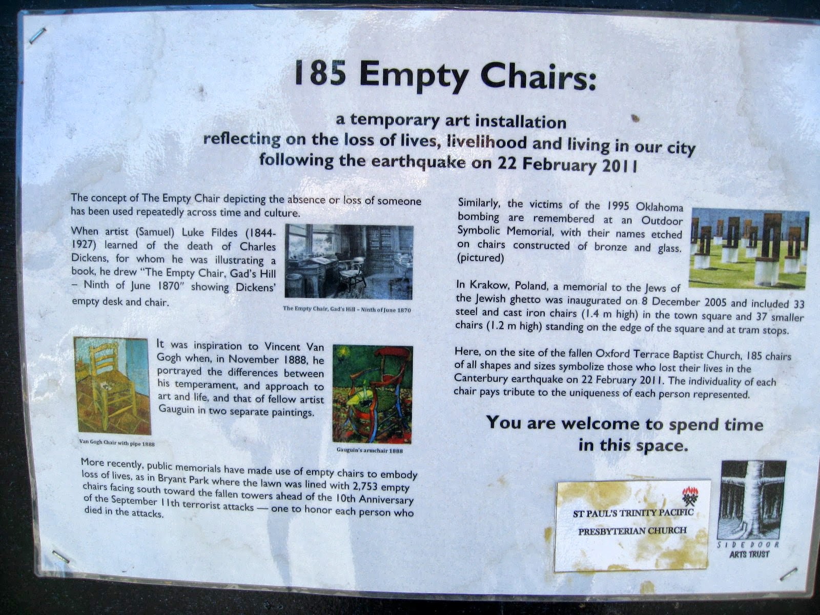 The sign tells of the many times empty chairs have been given meaning by artists: Vincent van Gogh, the site of the Oklahoma Bombing, the NY 9/11 site. . .