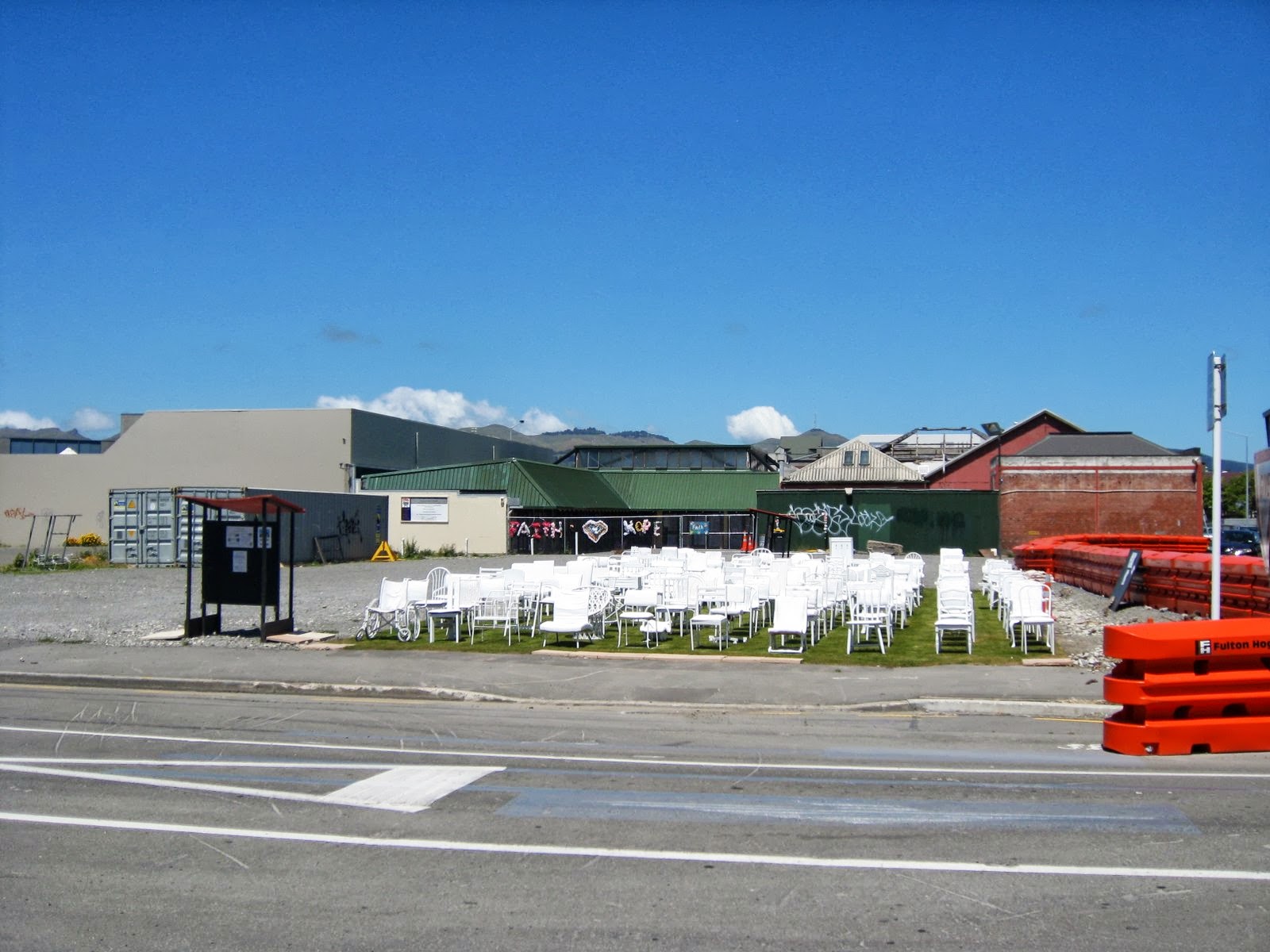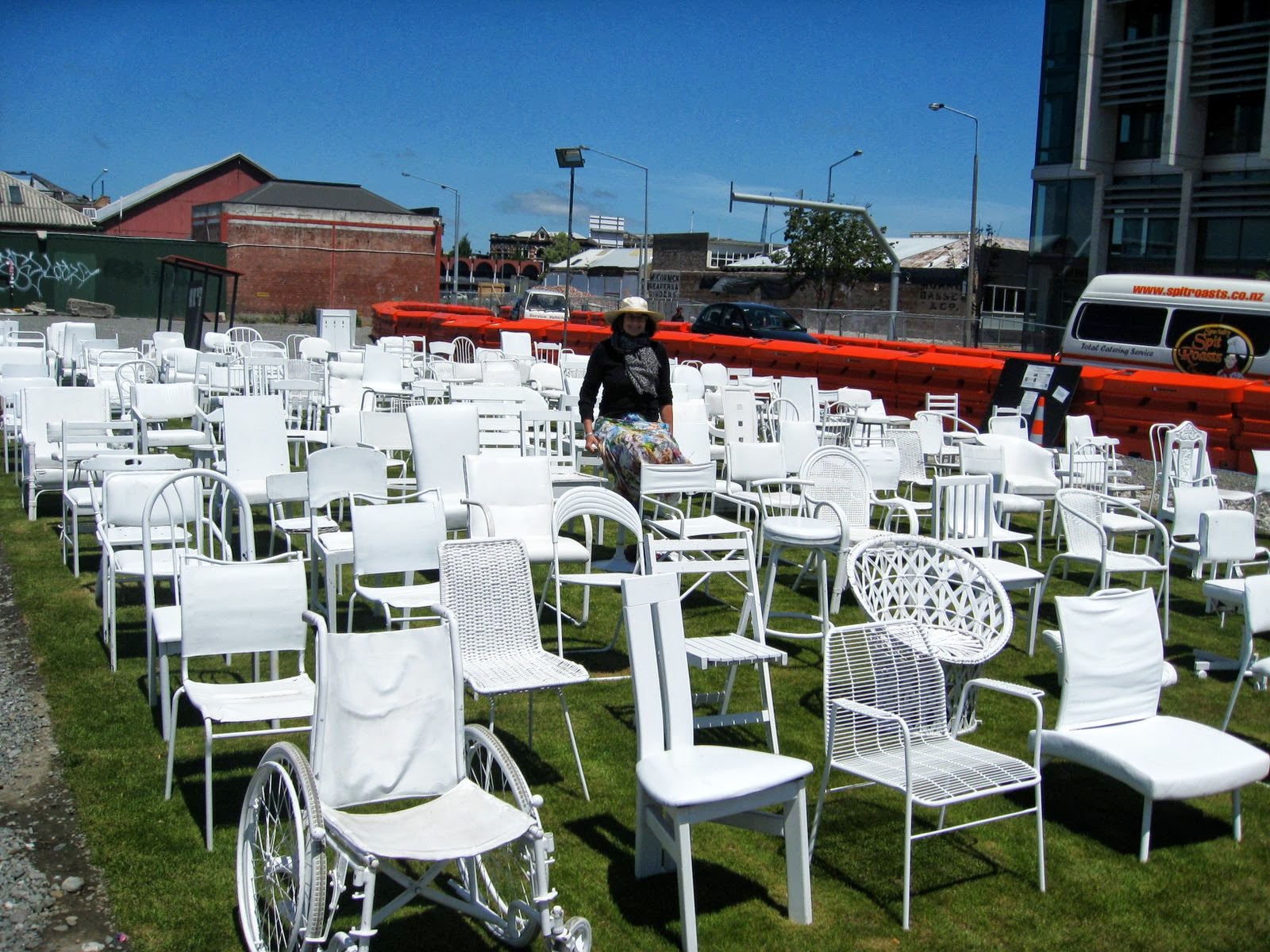 The site is a memorial to 185 people who died in the Christchurch earthquakes.People are invited to select a chair and to sit for a while.It is a very moving and graphic work.