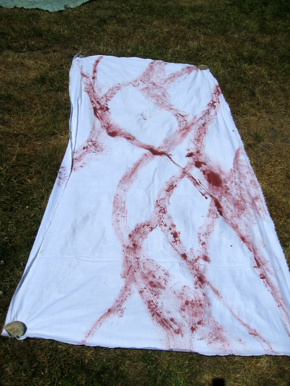 The first marks we made on our 3 to 5 metres of cloth where to be bold and free.I was not impressed when, with my first stroke, the too runny paint fell out of the brush to make a red puddle, a heavy-handed start for my cloth.