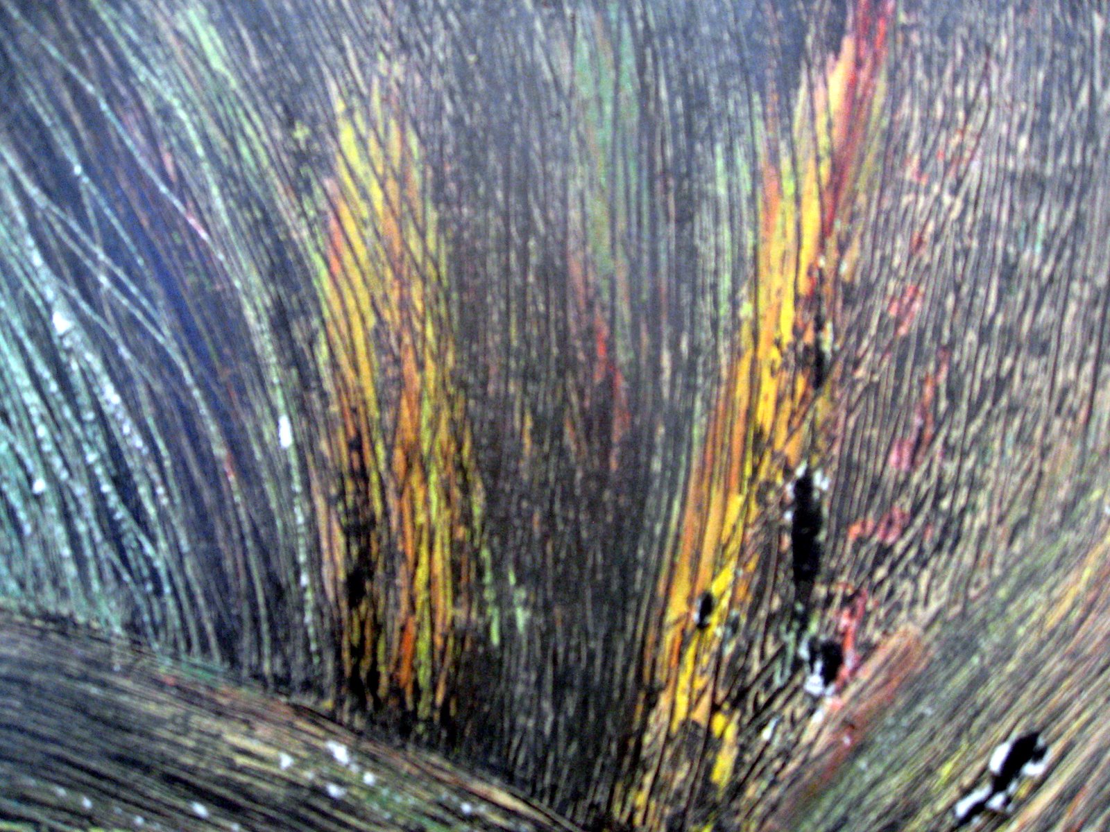 I was playing around trying a few of the many options Tony had suggested, when i remembered the bottle of waterproof ink on our supply list. i had been impressed with Tony's demo so decided to try it. i opened my new bottle...squirt... it splashed out and flooded the center of the piece. Did i stop and wipe it up? No! I continued to spread the ink over the whole thing, making it all black. By the time i remembered i was to wipe it back it was drying fast. So then i got out a blade and started scrapping it back until I was gouging the original paper.