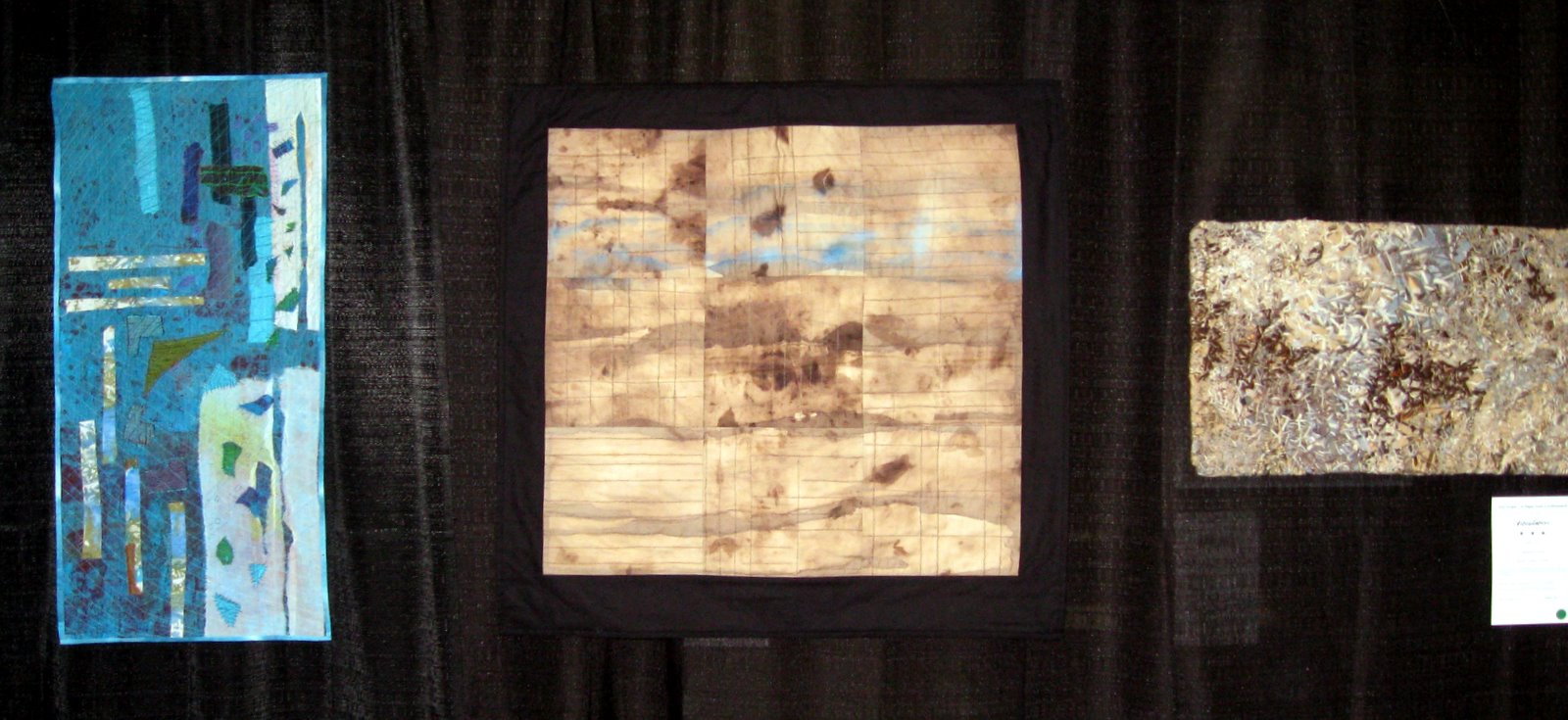 Middle - Gloria's work started as a black piece of cloth that she discharged, cut up and reassembled. The black boarder is lost on the black curtain.
