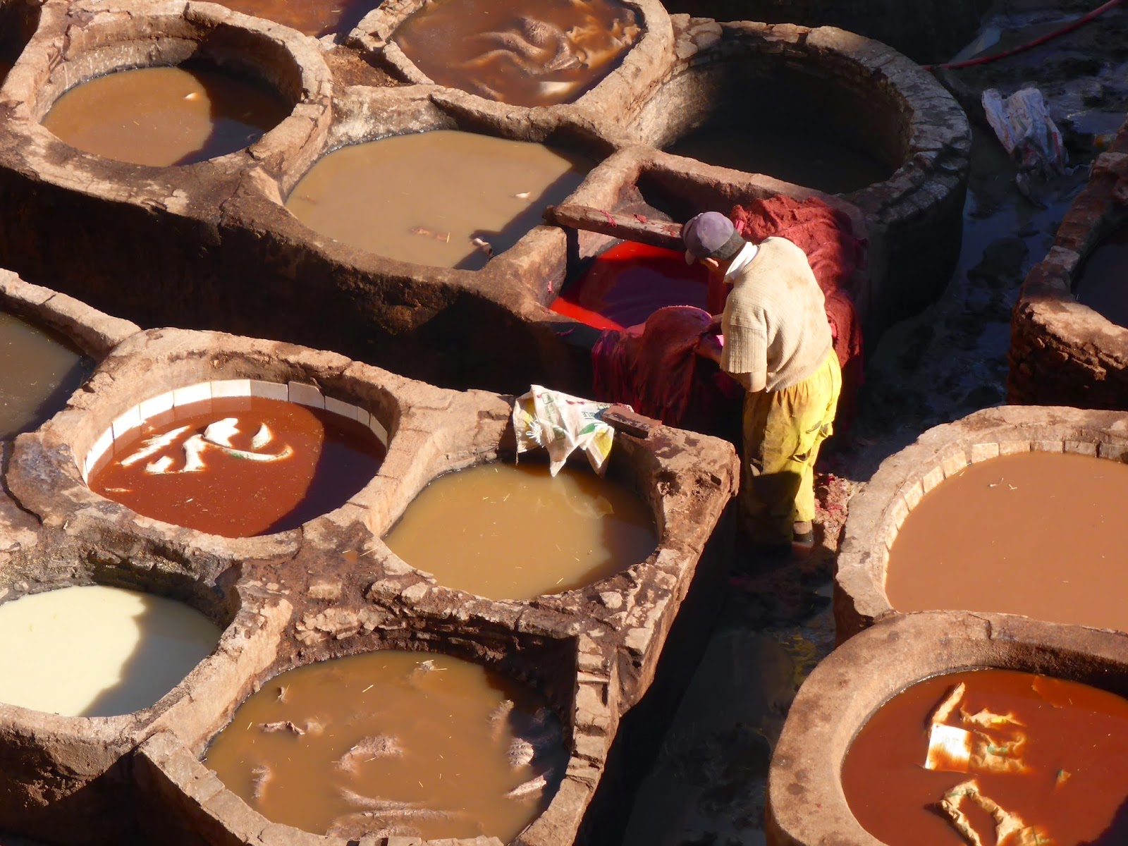 The Fes medina has a dyers' district where dyeing skills have been handed down through many generations. Hand-woven woolen and cotton cloth, tanned hides of camels, goats, cattle and sheep are tanned and dyed at a number of different tanneries.