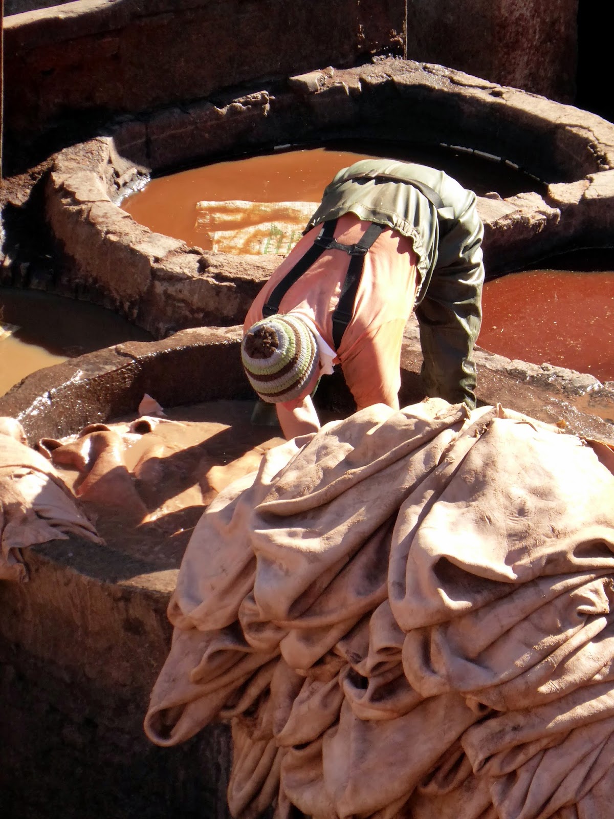 Fullers stomp on the hides in the vats then lift them out. It is back-breaking work for only the strongest. And the smell... but you probably don't notice it when you work there every day. Visiting tourists are handed a fresh sprig of mint to help the delicate ones cope with the smell. I found the smell to be not too bad, but I did remind myself we were there in winter. In the summer heat, I may have gagged.