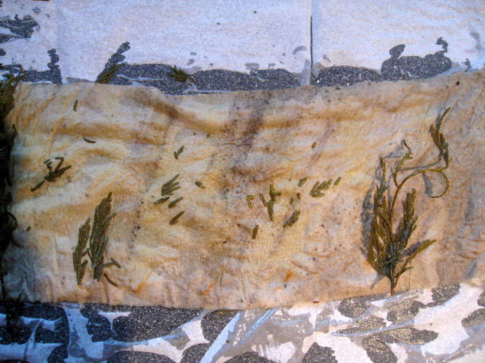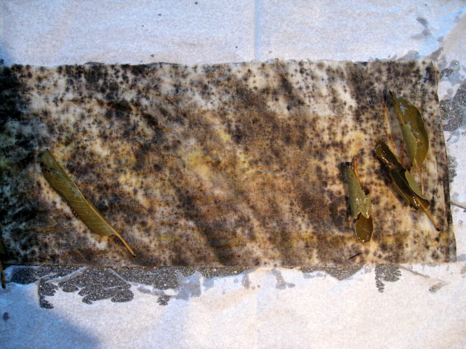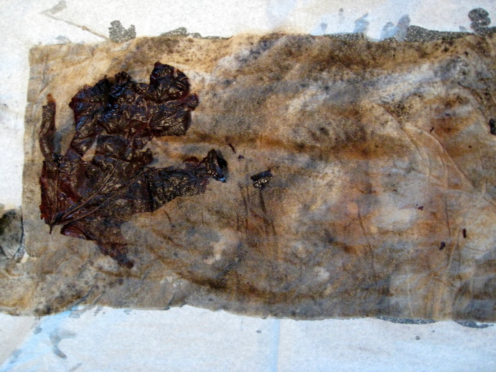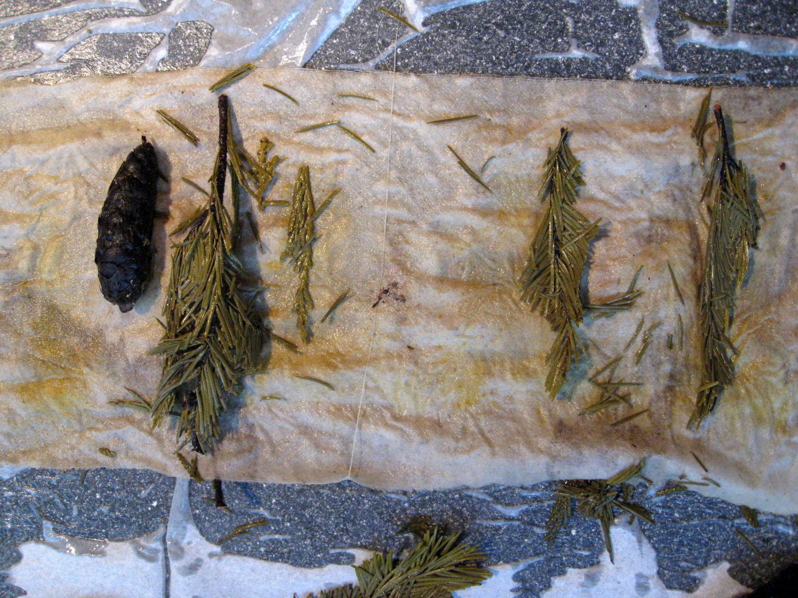 The tree cloths were inside, now it was my turn to respond in this ongoing dialogue. Perhaps I could add more marks on the cloths using materials from each tree. I needed to test each tree's dye/stain potential so used India Flint's eco-printing technique of tightly wrapping material with cloth and steaming it.