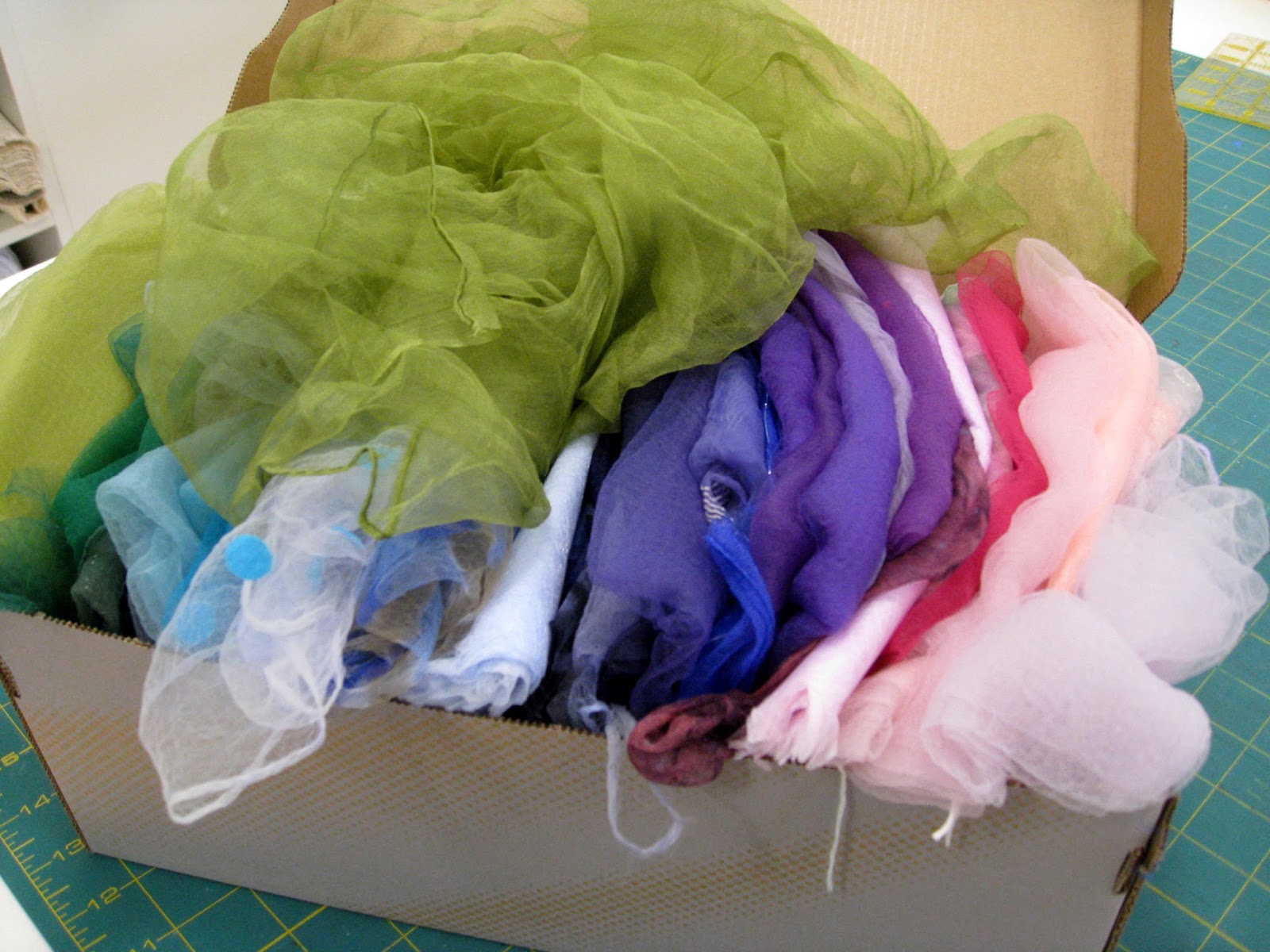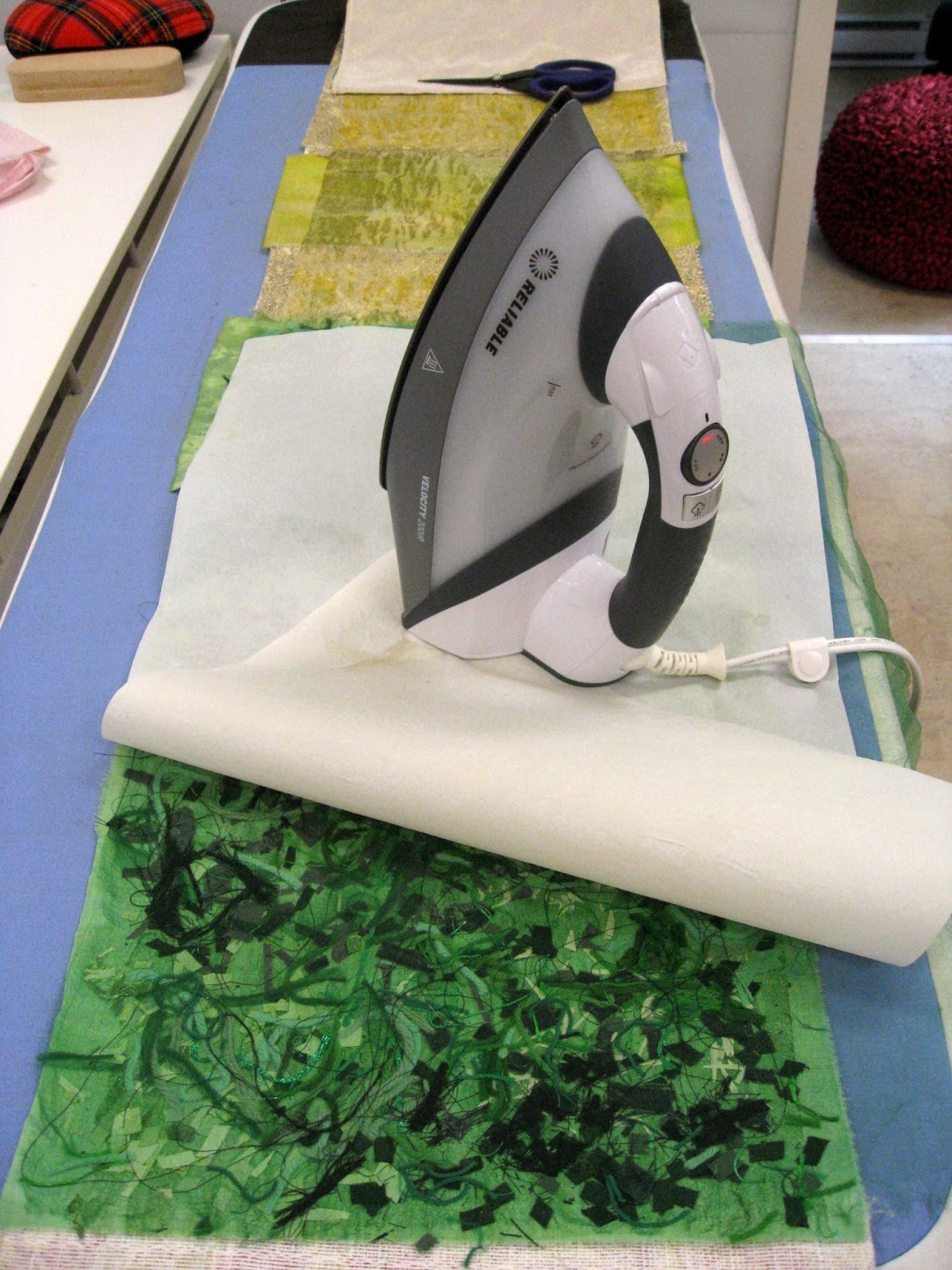 Bonding the snippets and nylon scarves in place using parchment paper to stop the iron's sole plate from getting gunked up.