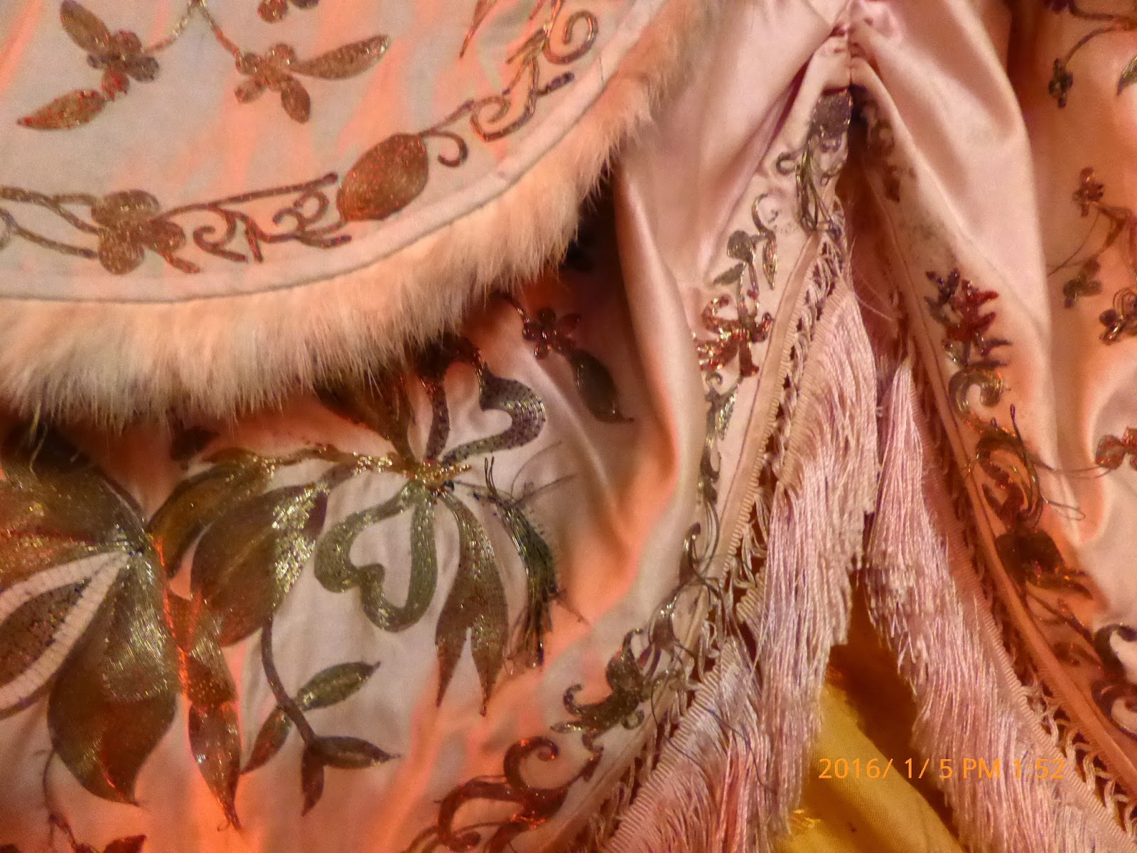Detail of gold work embroidery on silk satin trimmed with rabbit fur and silk fringe.