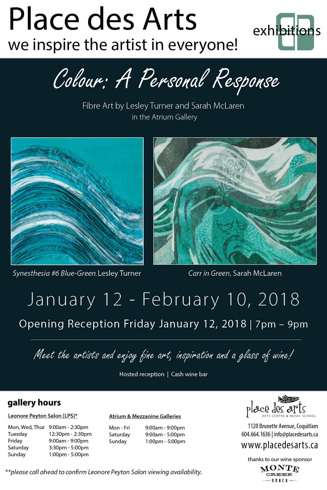 Sarah and I are so looking forward to the January 12 opening reception for our exhibition 'Colour: A Personal Response' at Places des Arts, 1120 Brunette Ave, Coquitlam. 7 to 9 pm.