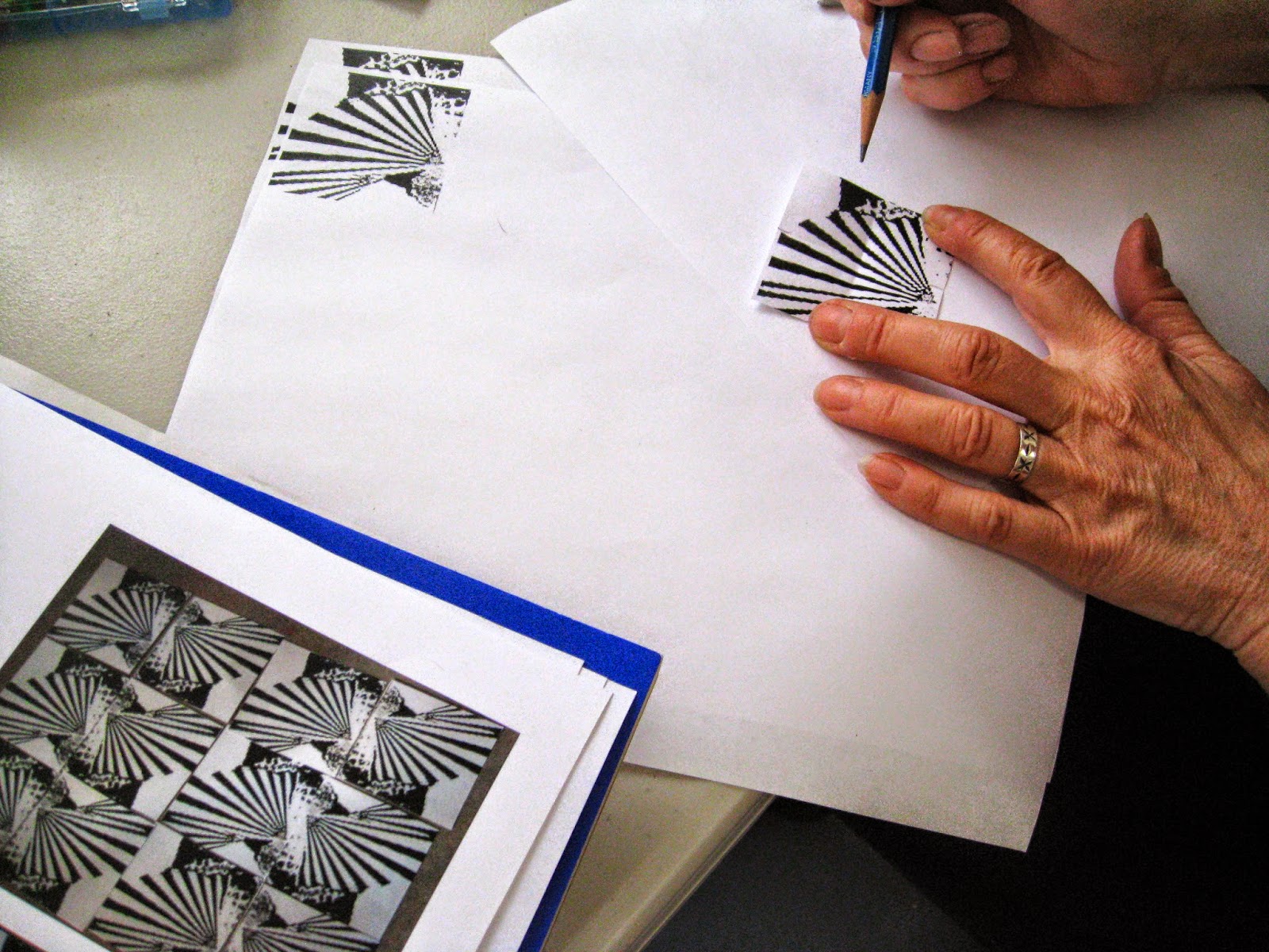 Sarah is exploring pattern making with a design based on lines found on rocks.