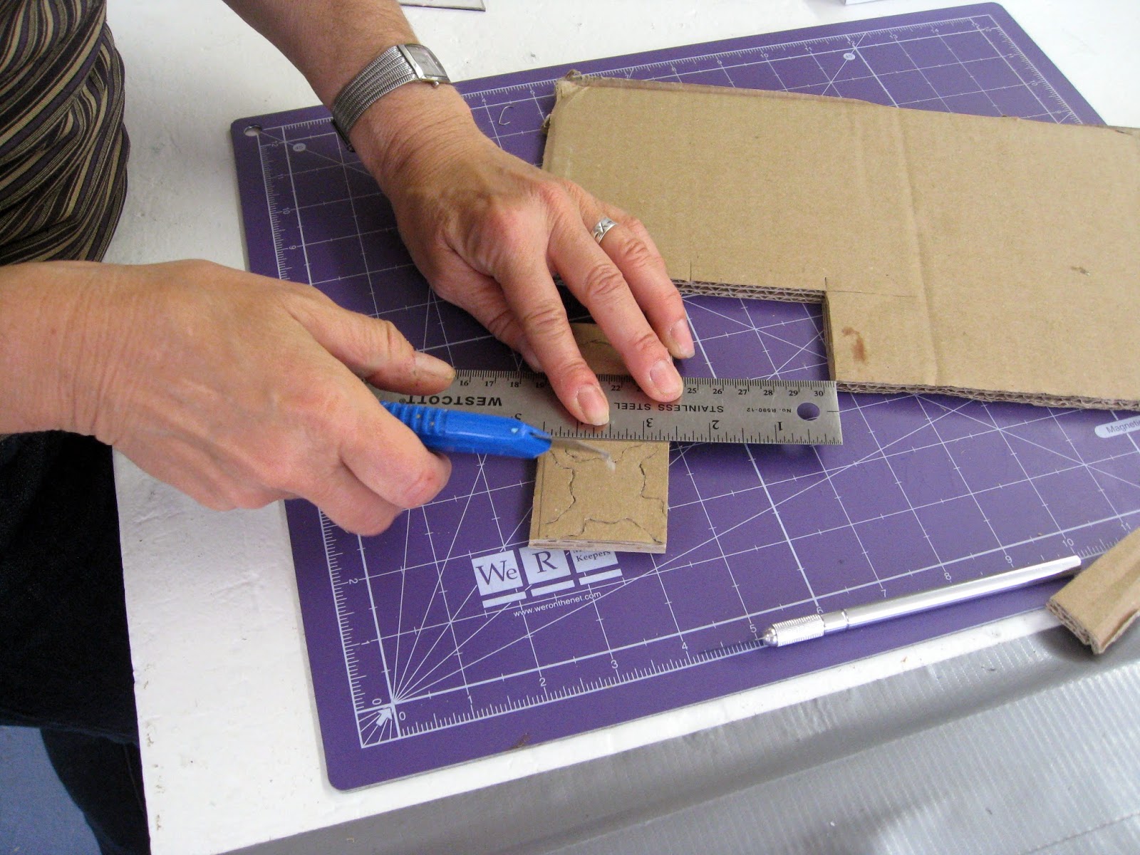 Connie cuts a quick, inexpensive corrugated cardboard stamp to trial a design.