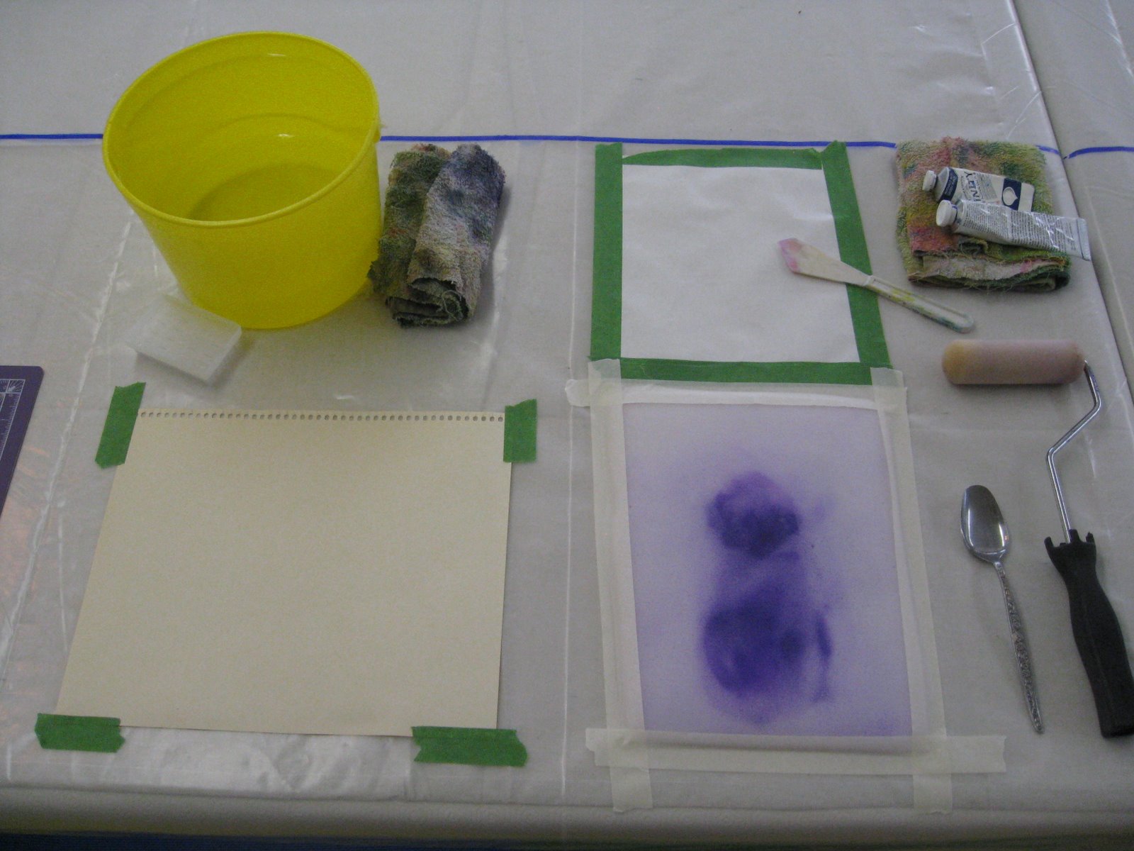 This is a print station. I learnt this set-up from Eleanor Hannan when I was in her Compositional Cloth course at MISSA this past summer (it is officially fall now). I found having the large foam print pad made printing so much faster than inking with a breyer or roller.