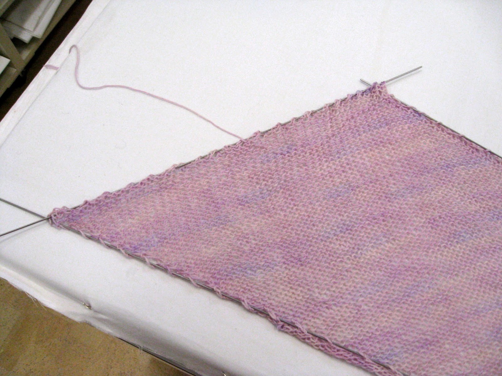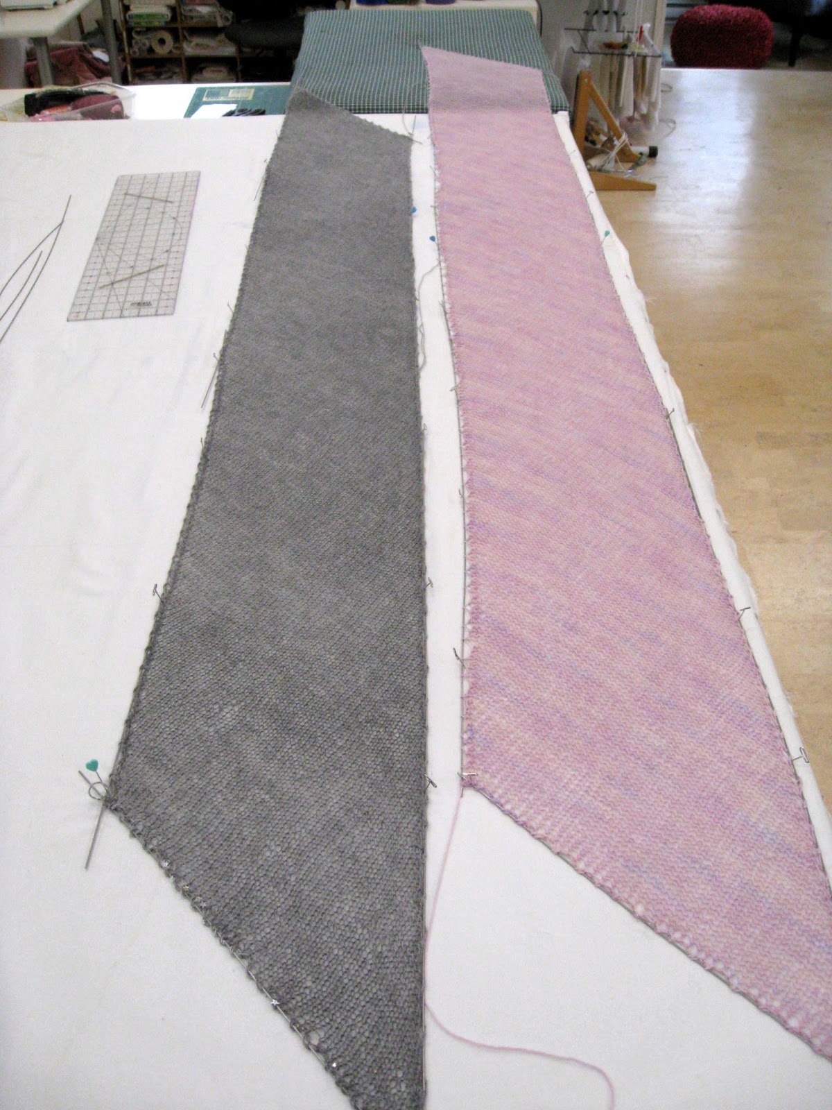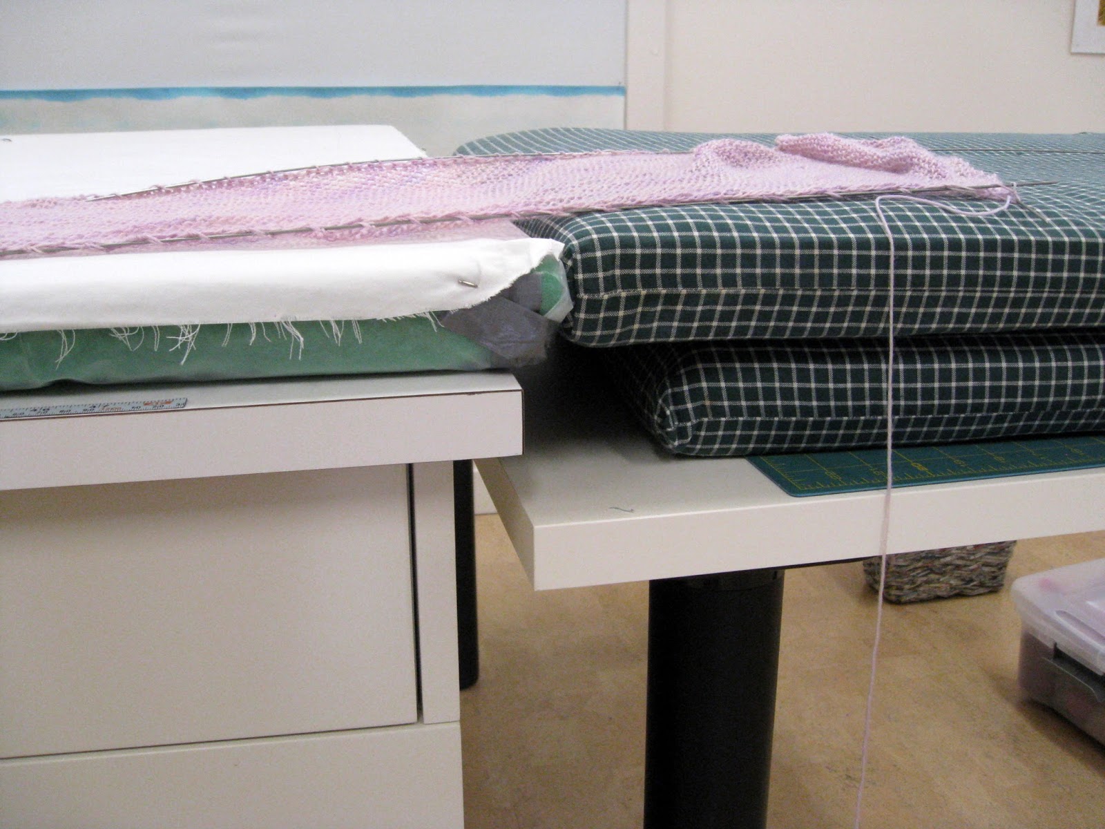 I moved the furniture around in the studio again to be able to block some loooong knitting. I had to build up the lower cutting table to extend the flat surface to block on.