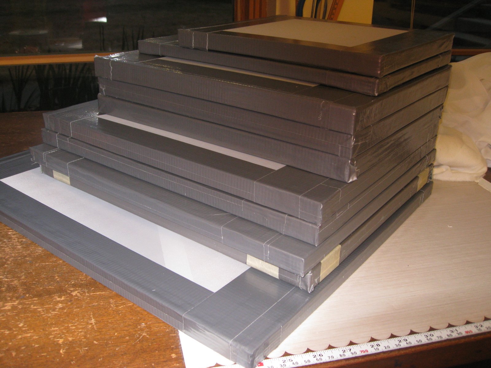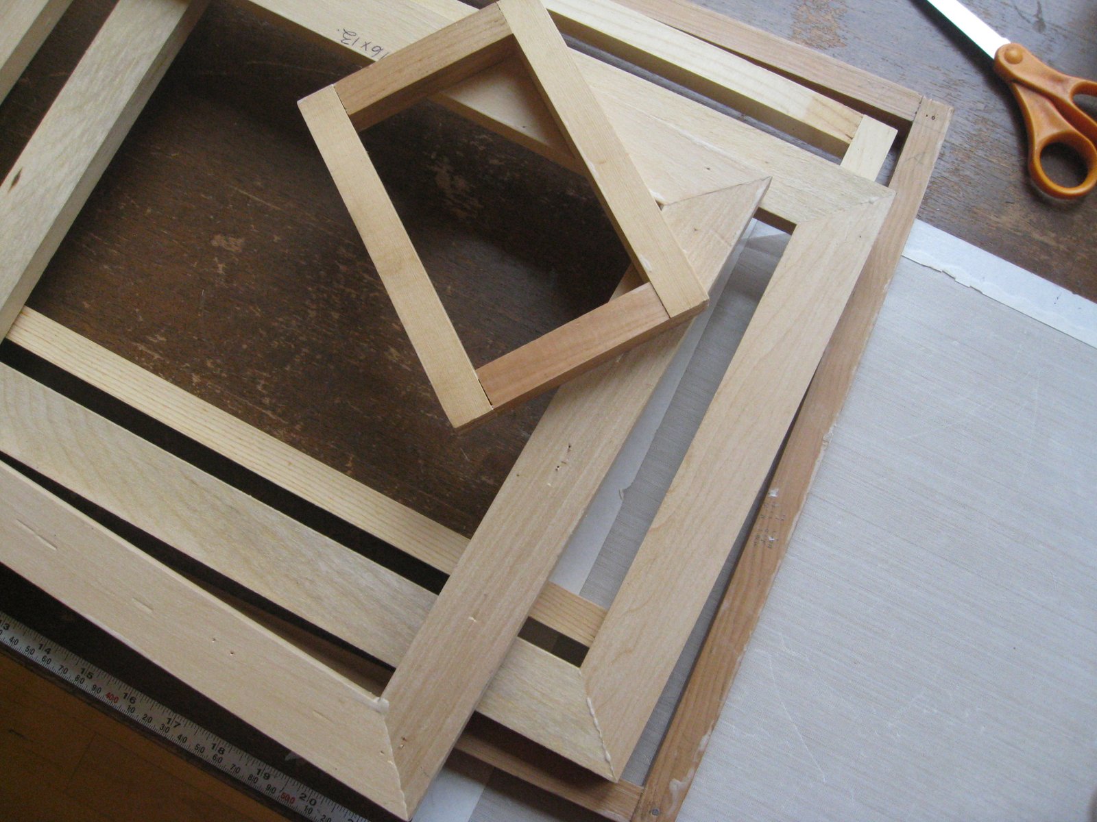I am exploring screen printing techniques.I made a pile of screen frames from stretcher bars, picture frames and bits of wood then sealed them with 2 coats of marine varnish.