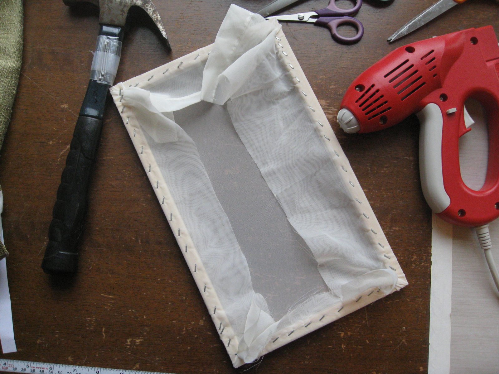 I bought a variety of drapery sheers from thrift stores and gave them a good wash.I experimented with different ways of attaching the screen to the frame.